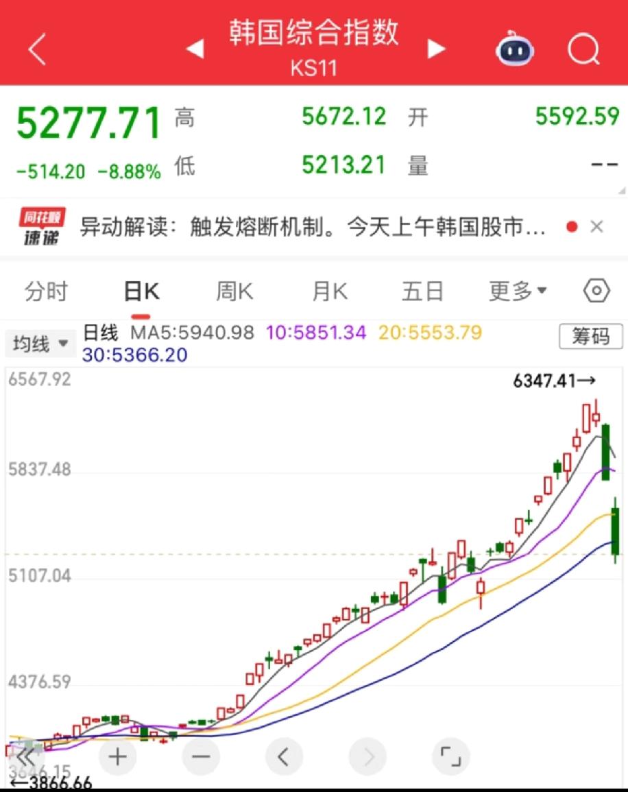 大家还会羡慕韩国股市吗?之前韩国股市和咱们A股一起涨到四千点,之后A股就没再怎么涨,一直停在原地,可韩国股市两个月里一路猛涨,直接冲到了六千点。谁知道这才没几天,之前花了一个月时间涨上去的点数,两天就全跌没了,今天韩国股市还触发了熔断机制,跌了快十个点。日韩两国的能源大多靠中东输送,受中东局势影响股市下跌是意料之中的事,但能跌得这么厉害,跌幅这么大,实在是超出想象。资本市场的变化就是这么快,涨起来快,跌起来更快。