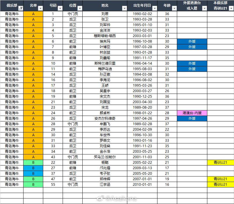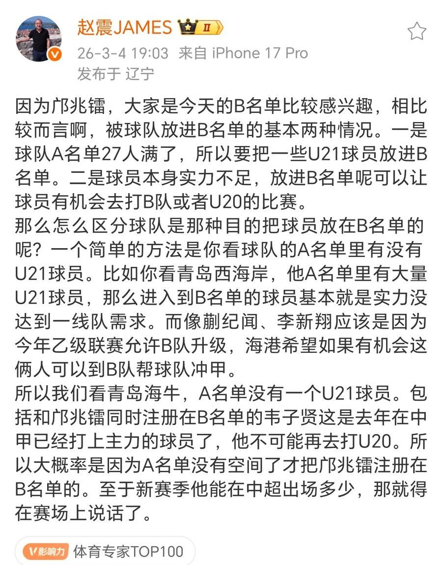 对中超降维打击的的邝兆镭,为何被青岛海牛放入B名单!名记赵震解释:海牛大概率是因为A名单没空间了才把邝兆镭注册在B名单! 显然这两人逻辑对不上,如果说像某位名记所说,邝兆镭对中超是降维打击,那么应该直接进A名单。把别人挤下去才对啊,不应该像赵震所说,没有空间了。 这个B名单,像泰山、海港、蓉城、三镇、英博五支球队B名单球员,是即可以踢中超,也可以踢中乙,而海牛的B名单,是即可以踢中超,又可以踢U21联赛。 海牛是担心邝兆镭上不了场的时间,让邝去踢U21联赛,是不是这个意思呢?