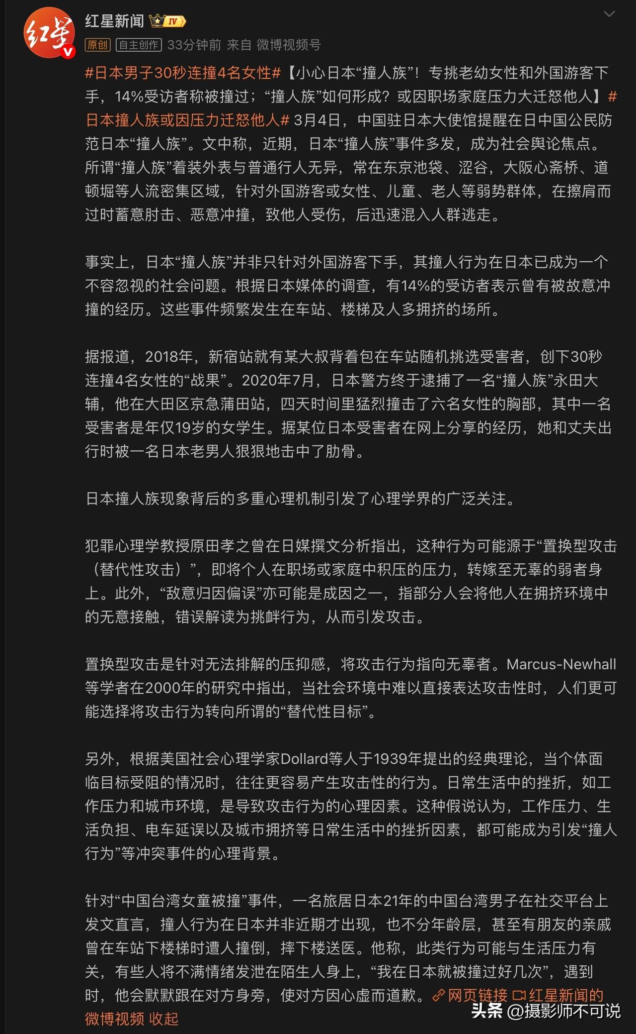 日本“撞人族”的频繁涌现实在是让人担忧,难道其民族劣根性再也掩饰不住了?近段时间关于日本“撞人族”的报道频现,在这些报道中撞人族男女都有,主要表现在公共场所的弱势群体在冷不丁的情况下被路过的人故意狠狠的撞翻,还有些男性不法之徒将撞击目标锁定在女性的敏感部位。据报道显示这些撞人族专以撞人为目标,有些甚至连续作案!专家说这些人在职场或家庭中积压了巨大压力无处宣泄,然后转嫁至无辜的弱者身上。看到这里我忽然明白为什么日本对给它们扔蘑菇的美国毕恭毕敬,摇尾乞怜,竭尽献媚之能事,而对其他国家却是不断漏出獠牙跃跃欲试的样子。要我说,这就是它们的民族劣根性的具体体现吧!记录我的2026