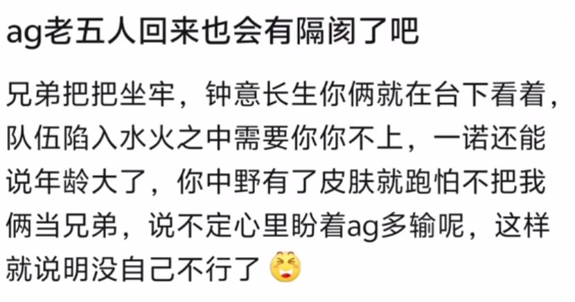 kplK吧热议:老实说,AG老五人就算回来,也会有隔阂了吧?