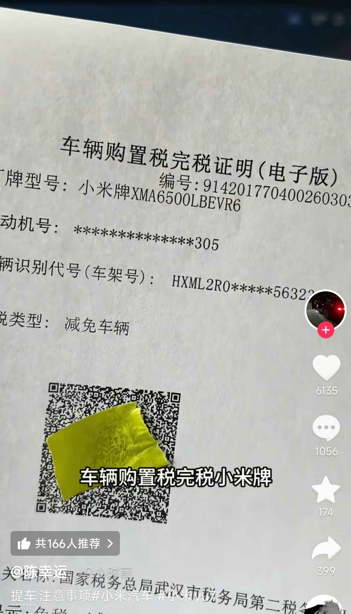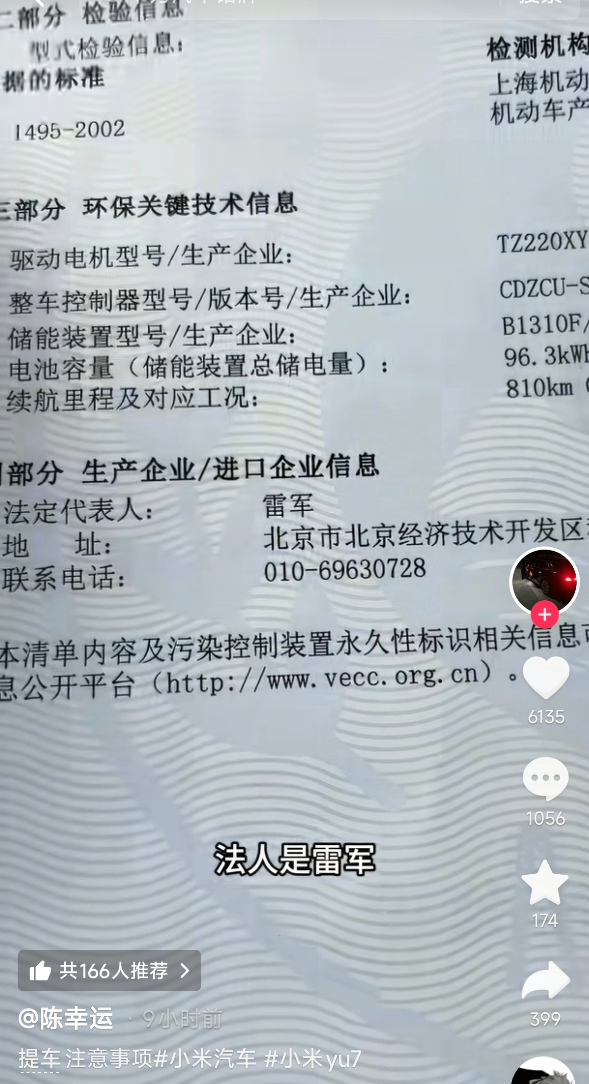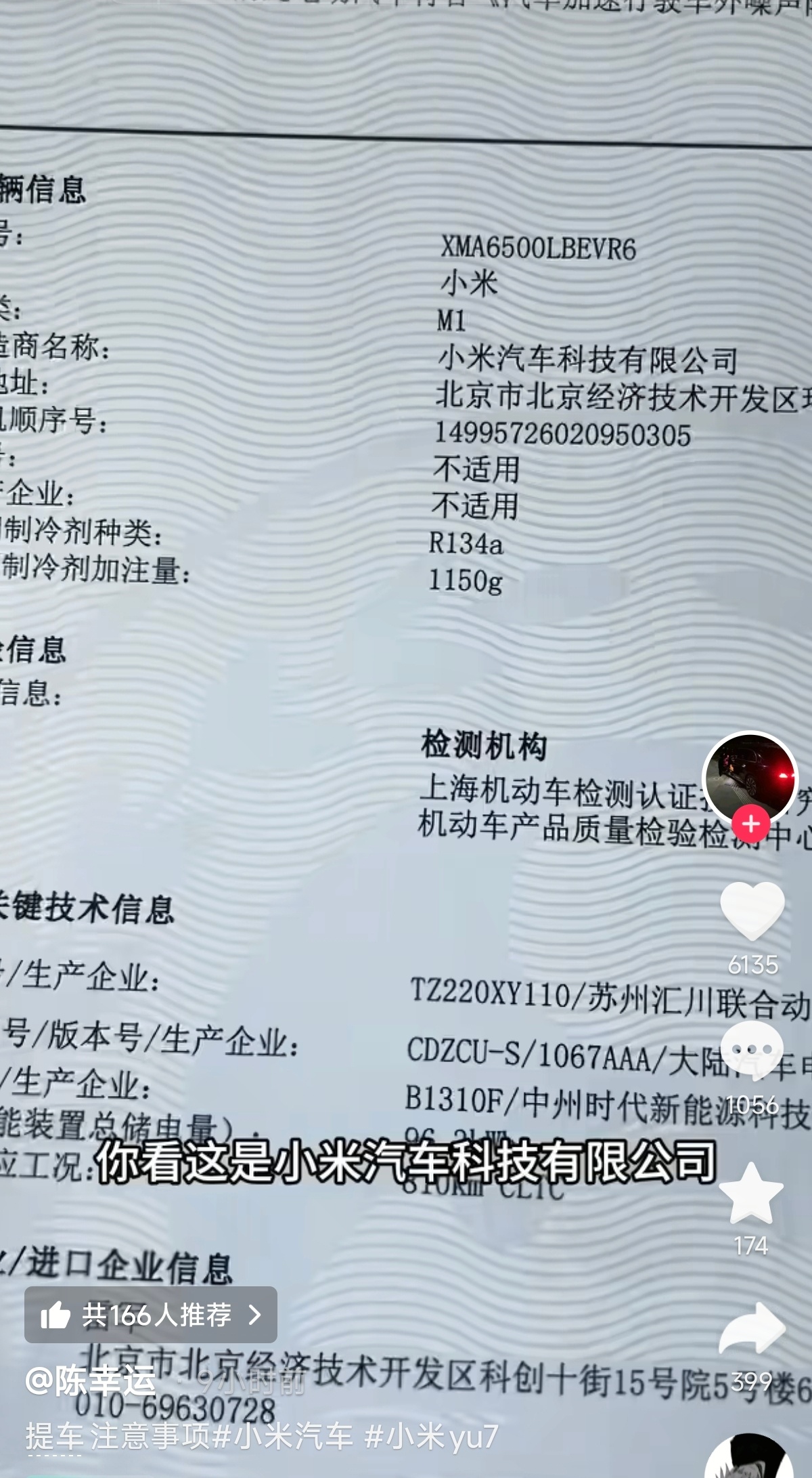 他提供了购买车辆的铭牌、车标、税收证明、车辆信息、法人、合格证、车辆购置税证明、绿本、行驶证等信息,上面明确写的是小米牌,制造商小米汽车,法人是雷军。