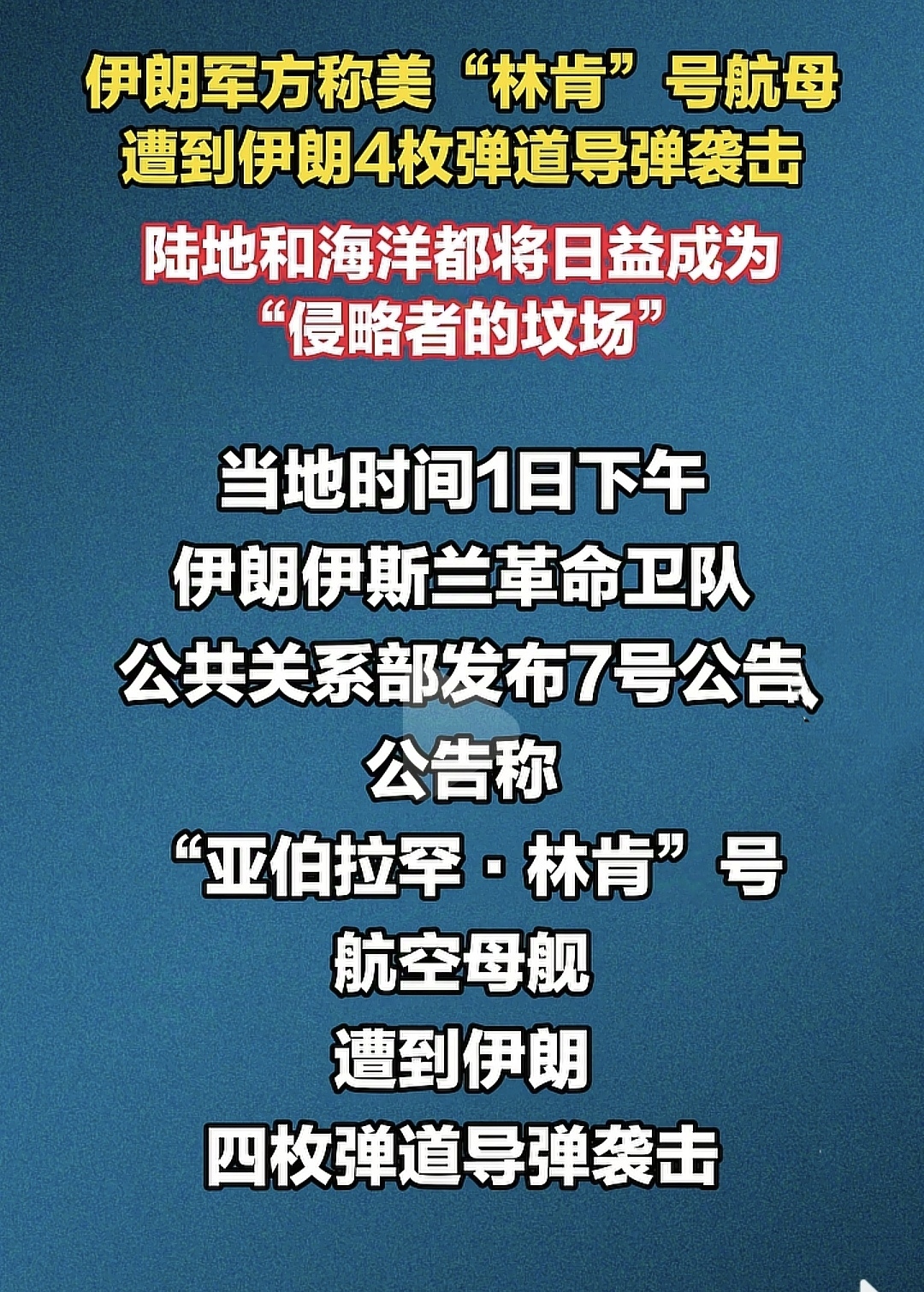 比起以色列本土被轰炸,伊朗还宣布了更振奋人心的战绩,比如大规模打击美军基地,导致至少200名美军伤亡,更炸裂的是向林肯号航母被四枚弹道导弹轰炸。伊朗表示,全体指挥员都很安全,现在仅仅是清导弹库存,还有更强大的底牌没有使用。打击美国航母后,伊朗军方表示,陆地和海洋,都会成为“侵略者的坟场”。