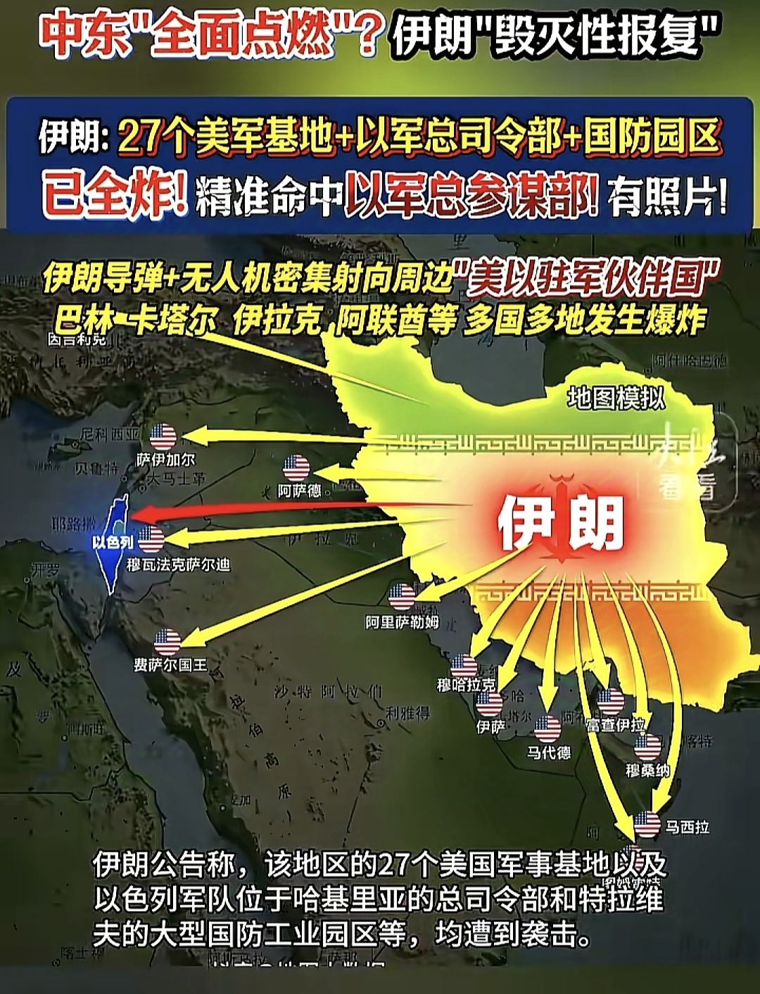 伊朗已经打上头了,发射的无人机和导弹根本停不下来,以色列本土不断被轰炸,美国在中东的各大军事基地更惨,根据伊朗发布的最新战报,24个美军基地被毁灭性打击,以色列总司令部和国防园区被多枚弹道导弹精准命中,连以色列总参谋部也被炸毁。
