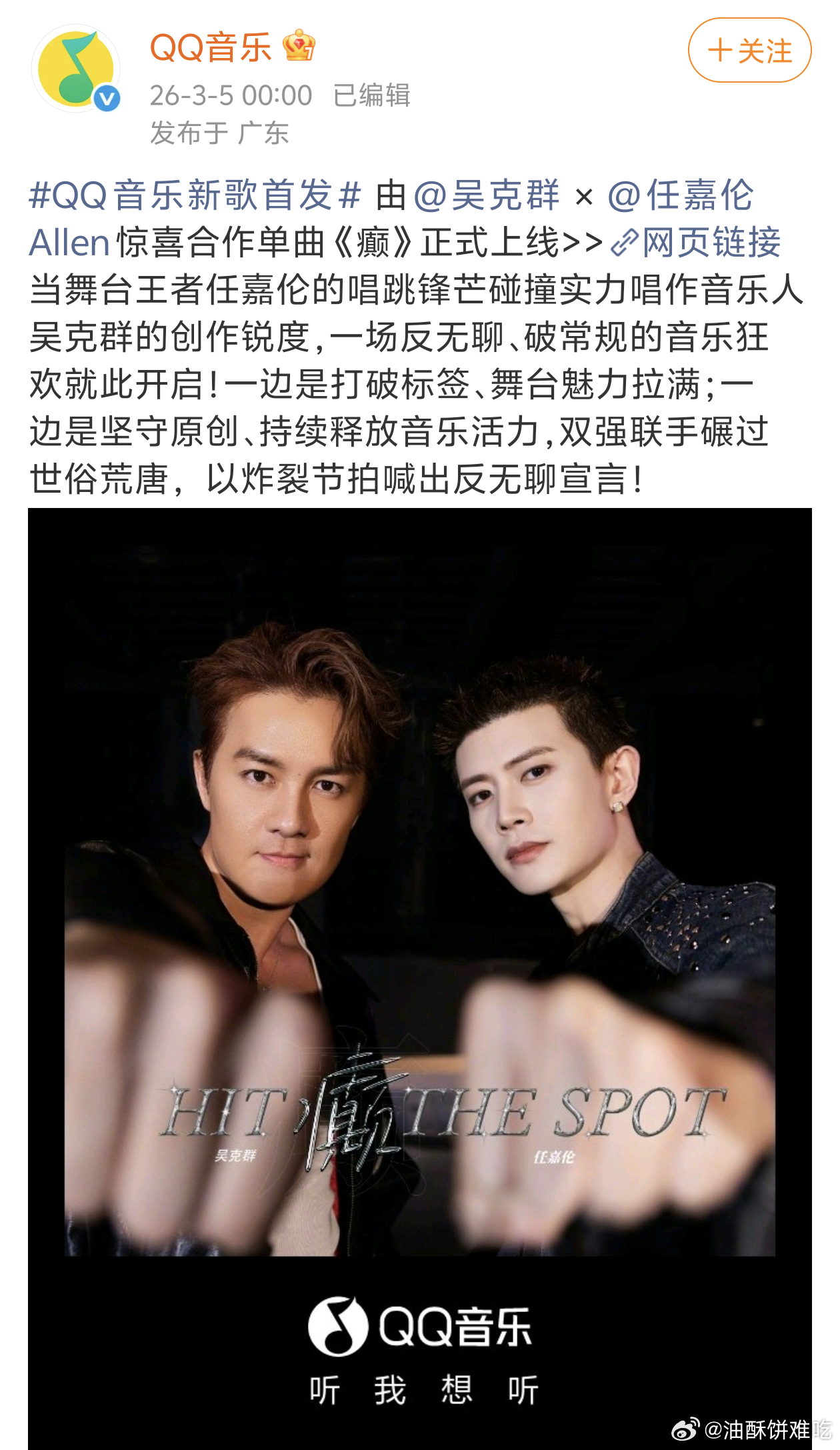 吴克群和任嘉伦的合作单曲《癫》正式上线!!!舞台王者任嘉伦与实力唱作音乐人吴克群的巅峰碰撞!网页链接