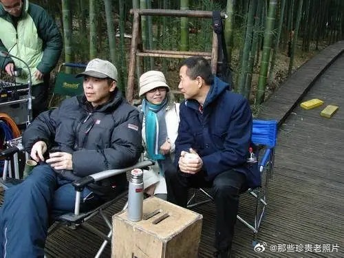 2005年,电影《夜宴》拍摄现场,导演冯小刚,影片作曲谭盾,片尾曲演唱者张靓颖。