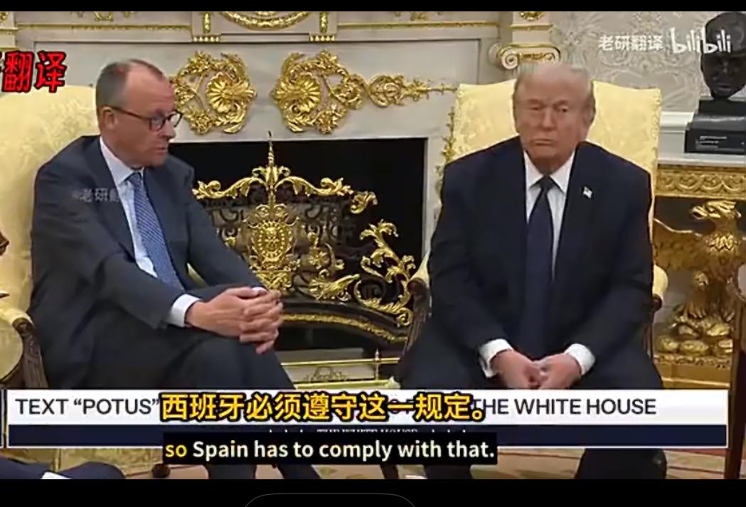 德国总理默茨:总统说得对,我回去照做! 记者当面询问德国总理默茨,如何回应特朗普宣称要制裁西班牙一事。 默茨表示,总统说得对,这一要求合理,西班牙必须遵守这一规定,他会去说服西班牙。 默茨在特朗普面前极为顺从,连一句为盟友辩解的话都没有,这简直就是胳膊肘往外拐,完全成了美国人的忠实仆从。他声称要说服西班牙将军费提升至占GDP的5%,还称特朗普要求将军费从2%提升到5%非常正确。这简直是彻底把主权拱手让给美国,美国说什么德国就做什么,完全是在跪舔。 增加这么多军费,不就是向美国军工联合体交保护费吗! 身为欧盟老大的德国,如此言听计从,真是让人汗颜。这也给我们提了个醒,德国不可靠,对欧洲有些国家不可抱有幻想,要当心他们随时媚美翻脸。