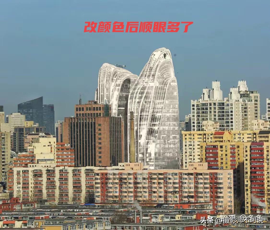 北京这两栋建筑实在是太让人难以理解了,每次看见都心头一抽抽,有种夹杂着对巨物和难以名状之物的恐惧感,生理和心理都会产生双重不适。尤其是在夜间,猛的一抬头看见这两栋黢黑的大家伙,就像是两个巨大的黑色垃圾袋耸立在哪里,总感觉有几分邪恶,又像是刚发生过火灾,把玻璃幕培都烧化了。那心里面的压迫感和恐惧感会被莫名放大N倍。丑建筑我见过很多,但让我每次看见都会很难受的恐怕就仅此一例。有好事的网友用后期方法把两栋建筑的颜色换了一下,立马就由邪恶感变得高大上了,由此看来还是配色的锅啊!