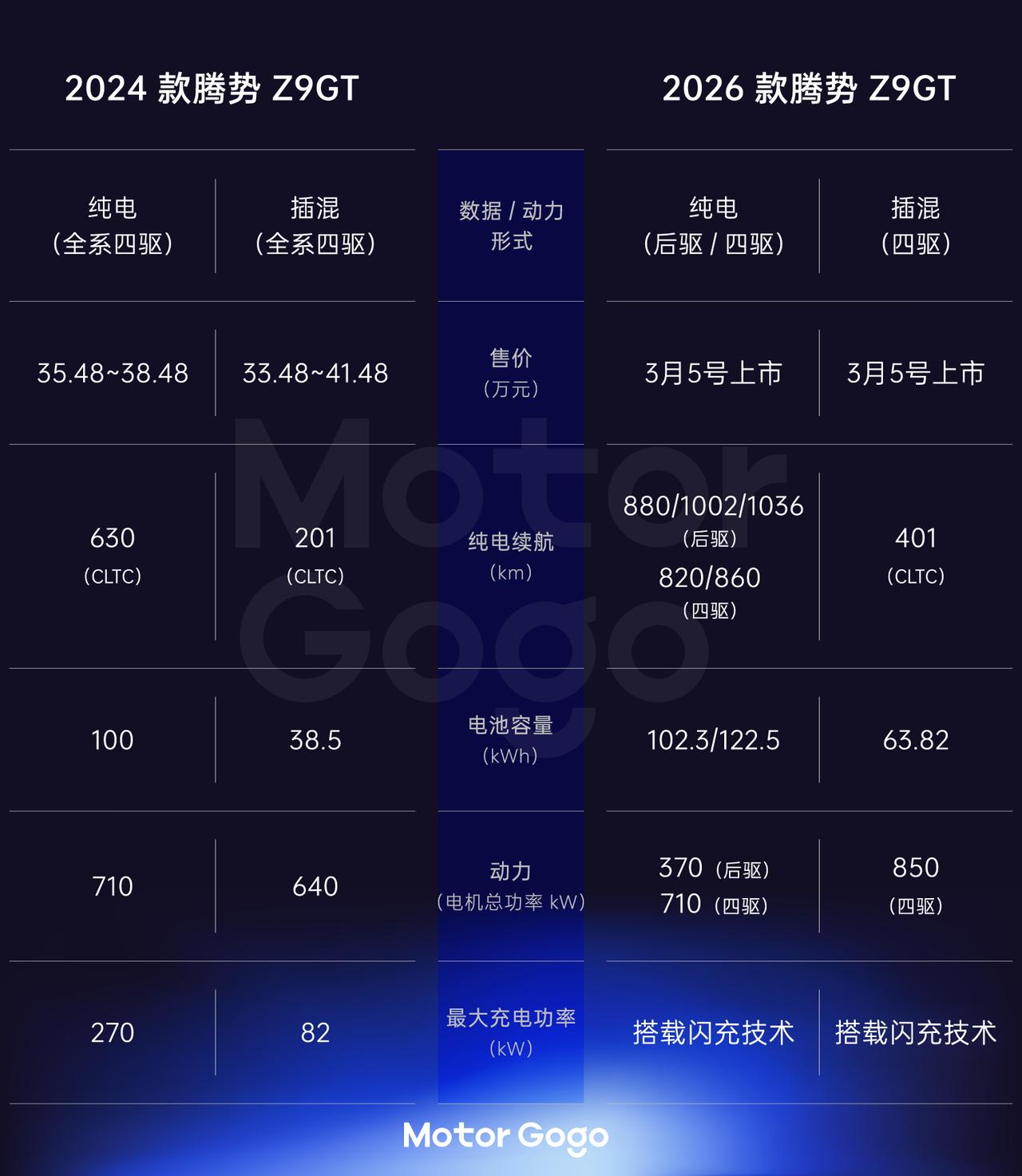 新款腾势Z9GT。确实是该调整的都调整了。 比亚迪主流品牌的纯电大车,3月5日后有突破800公里续航的了。 终于不再因磷酸铁锂的重量体积能量比,做不出中产阶层更想买的超800公里的本年度续航安心线的大车了。二代刀。 理想i8还是720。