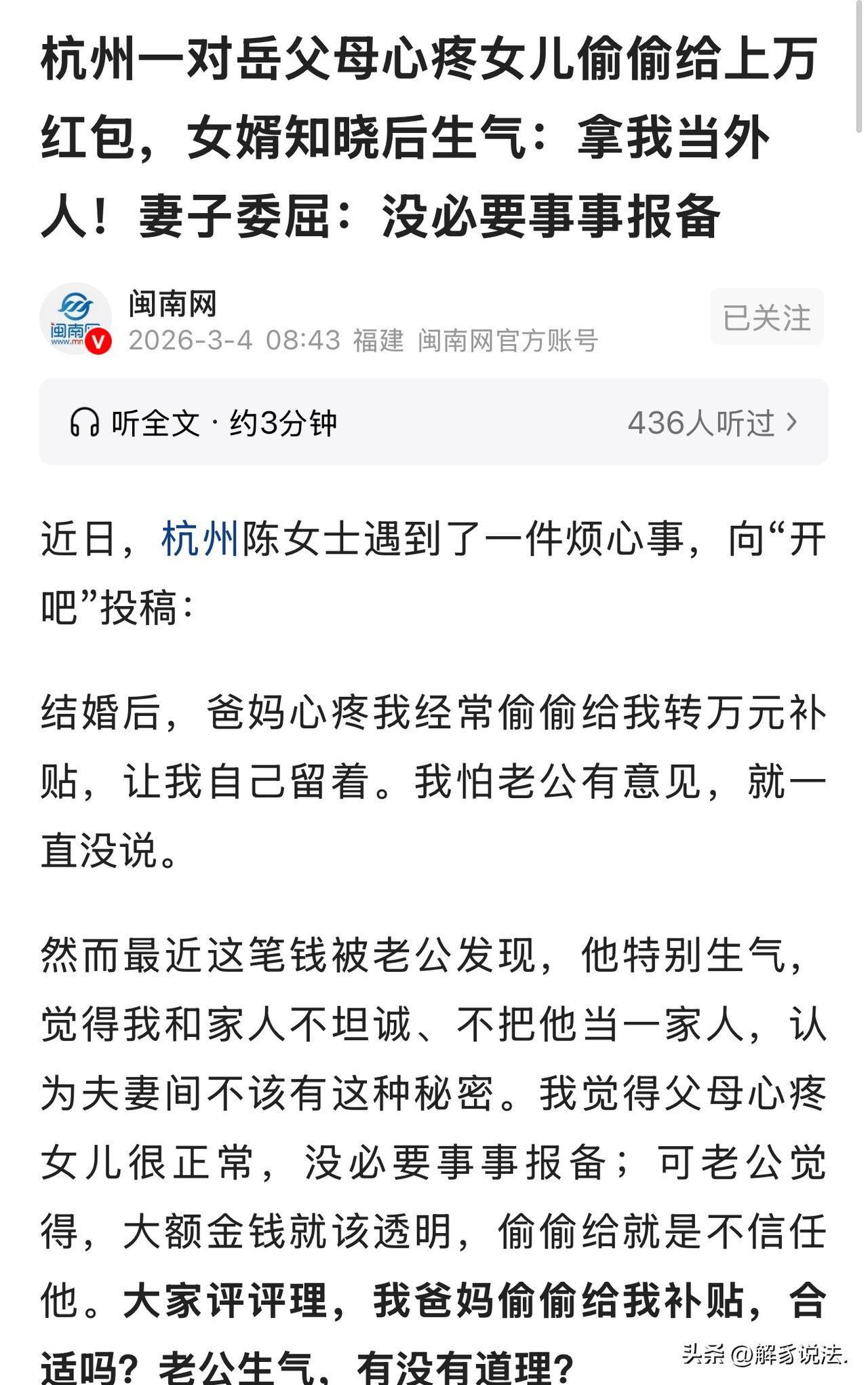 “这个丈夫格局小了!”浙江杭州,女子和丈夫日子过得拮据,父母心疼女儿,就隔三差五的给女儿转去上万红包,补贴女儿生活。女子担心丈夫没面子,伤自尊,就没把这事告诉丈夫。谁知,男子无意中知道了此事,暴跳如雷,和女子吵了起来,指责妻子拿自己当外人!同时他认为,大额资金必须透明!妻子十分委屈认为:没必要事事报备! 最近,陈女士因为一件小事和丈夫吵得不可开交,她实在心里觉得憋屈,只能向“开吧”投稿,和网友一吐为快,让网友给评评理。 陈女士和丈夫结婚没多久,小两口的日子过得不算宽裕,平时生活都得精打细算,工资除了房租、日常开销,几乎存不下什么钱。 陈女士的爸妈看在眼里,疼在心里,总觉得女儿嫁过去跟着受苦,又怕直接给钱会让女婿觉得没面子、伤自尊,思来想去,就偷偷给陈女士转钱,每次都是上万元,让女儿自己留着当私房钱,买点喜欢的东西,手里也能宽裕点。 陈女士心里明白爸妈的苦心,也知道这笔钱是父母心疼自己的心意,可她也有顾虑,担心丈夫知道后会多想,觉得娘家不信任他、看不起他,思来想去,就一直把这件事藏在心里,从来没跟老公提起过。 在她看来,这是爸妈给自己的补贴,又不是夫妻共同债务,也不是什么坏事,没必要事事都跟丈夫报备。 可纸终究包不住火,这笔藏了很久的钱,最近还是被老公无意间发现了。 得知真相后,丈夫当场就发火了,情绪特别激动。 他觉得,夫妻之间就该坦诚相待,不管是娘家还是婆家,涉及到大额金钱,就应该明明白白说出来,陈女士和娘家人偷偷给钱、瞒着不说,根本就是不把他当一家人,是对他的不信任,也是不尊重这段婚姻。 陈女士被丈夫的反应吓了一跳,也觉得特别委屈憋屈。 她实在想不明白,爸妈心疼女儿、偷偷贴补家用,明明是一片好心,怎么到了老公眼里,就成了不坦诚、不信任? 她没有乱花钱,也没有做对不起家庭的事,不过是想收下父母的心意,怎么就错了? 夫妻俩为此大吵了一架,谁也不肯让步。丈夫坚持认为大额资金必须透明,陈女士却觉得娘家给的钱没必要事事汇报,心里又委屈又难受,好好的日子弄得乌烟瘴气。 实在憋得难受,陈女士只能上网一吐为快,她想问问大家,娘家心疼女儿偷偷给补贴,真的不合适吗? 丈夫因为这件事大发雷霆,真的有道理吗? 此事曝光后,网友看不下眼去了,纷纷给出了自己的看法: 听说过老婆偷偷给岳父岳母钱生气的,还是第一次听到因为岳父岳母给老婆钱生气的,呵呵,这种男人,以后麻烦少不了的。 他生气的是,岳父母没有把钱直接给他, 他生气的是,自己的父母从没给过他零花钱, 不怕事比事,就怕人比人……这是恼羞成怒了!能耐不大,脾气不小,丢人现眼…! 男子应深感羞愧,你们已成家,为什么岳父岳母还要这么去关心惦记着她们的女儿,如果你有本事、有能力,那就用事实证明,你们过得好,不需老人家挂念。该男子能力本事暂且不说,从他生气的结果可以看出,不大气,小肚鸡肠。 《民法典》第1063条第3项规定:遗嘱或者赠与合同中确定只归一方的财产,为夫妻一方的个人财产。 陈女士父母私下转给女儿的钱,属于对女儿个人的赠与,不属于夫妻共同财产,陈女士有权不主动告知,老公无权强制要求上交或公开。 父母偷偷贴补女儿,本是出于心疼与爱护,并非不信任,而是怕伤及女婿自尊;妻子选择隐瞒,也是为了维护丈夫的面子,出发点全是善意。丈夫生气可以理解,但因此指责妻子不坦诚、不把他当家人,未免格局太小。 真正的担当,不是要求伴侣毫无秘密,而是懂得感恩岳父母的心意,反思如何让家人过得更好,而非把委屈撒在最亲的人身上。 夫妻之间,信任不靠强制透明,爱意也不靠事事报备。 多一份理解,少一份猜忌;多一份感恩,少一份指责,日子才能温暖长久。 真正的幸福,从来不是算清每一笔钱,而是守住彼此的心。 欢迎关注@解豸说法.