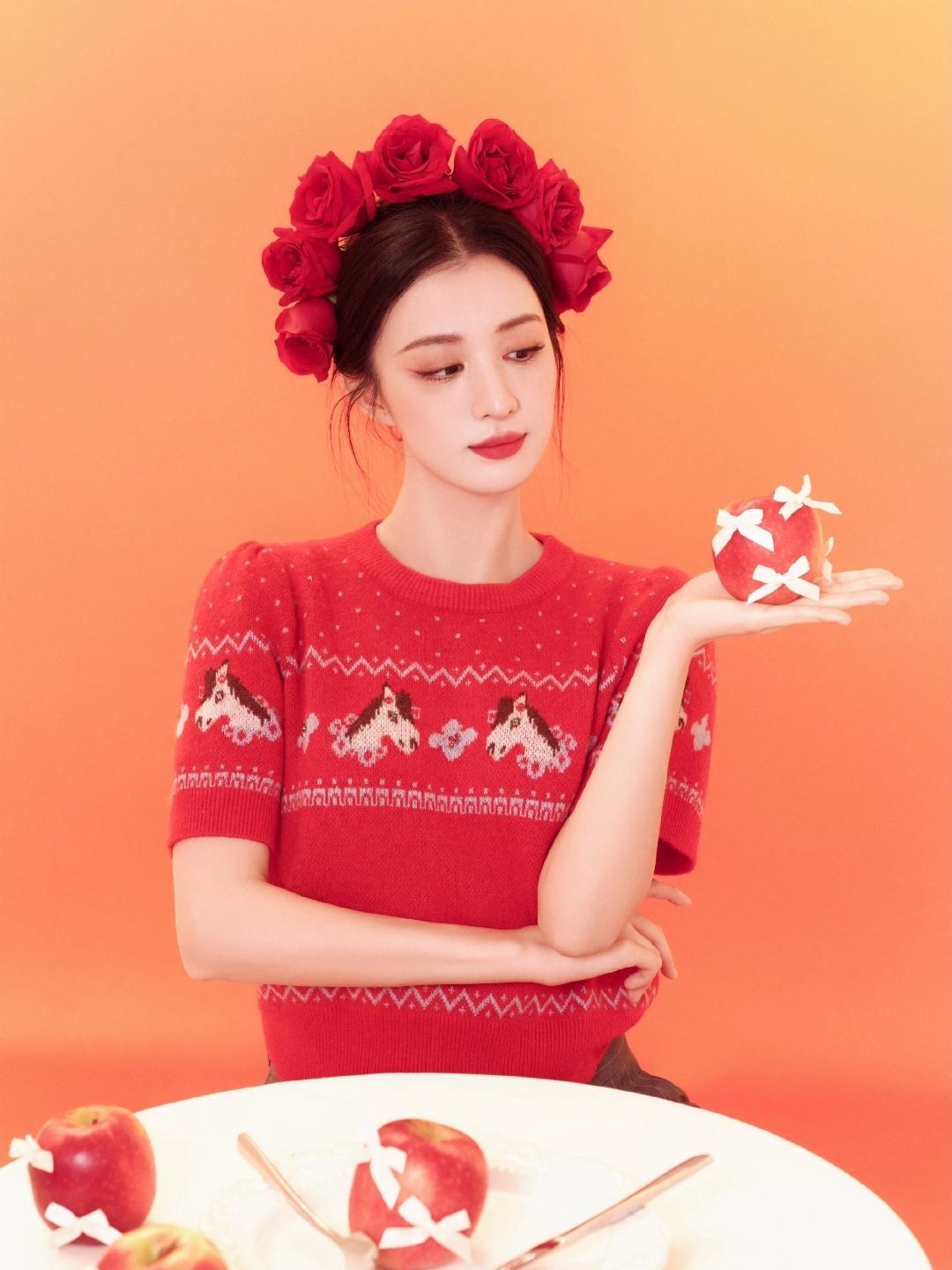 王楚然这组新年大片,堪称马年氛围感穿搭的范本。在暖橘色的柔光里,她以红为笺,以花