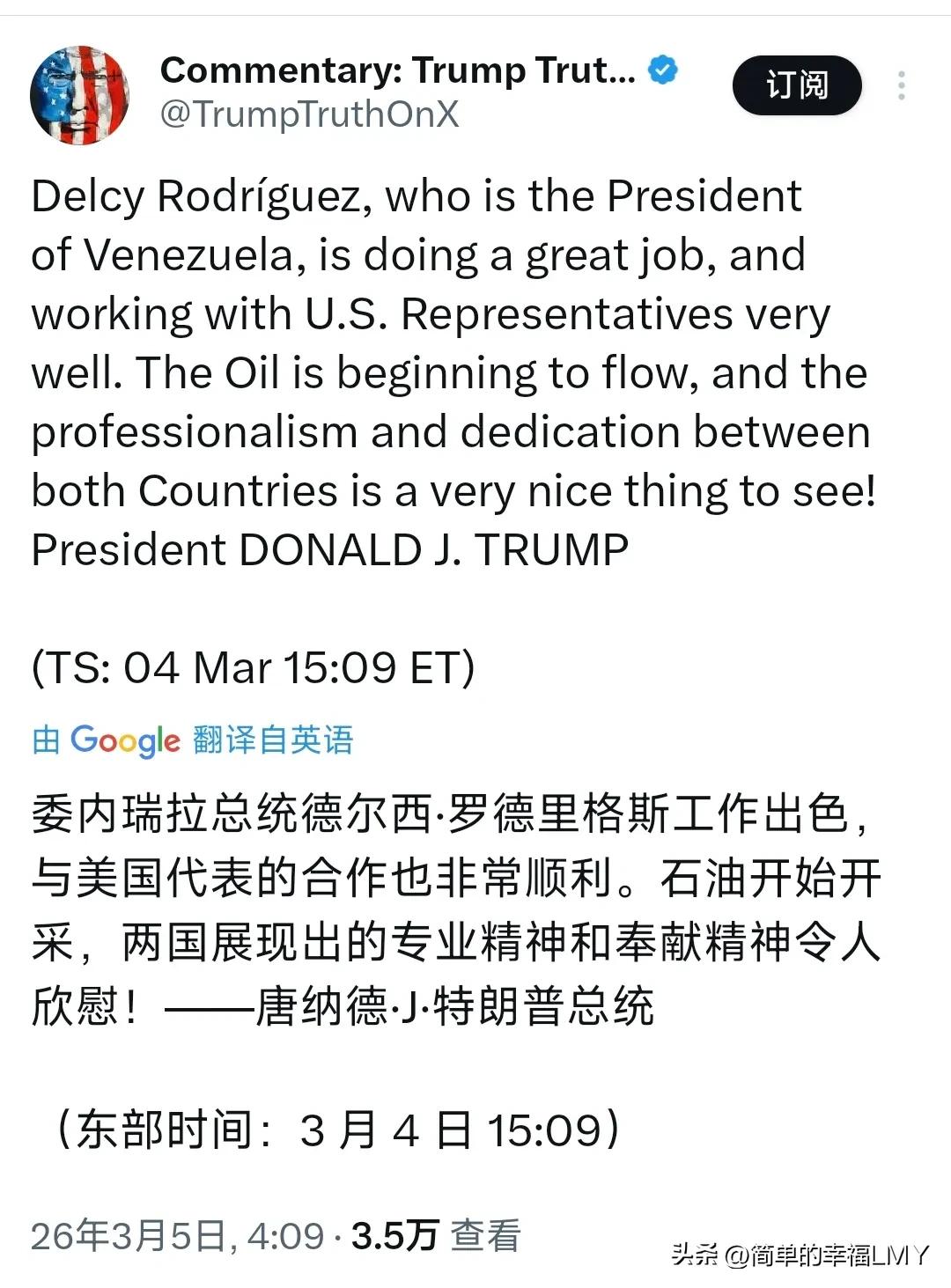 特朗普今天(北京时间3月5日)写道:“委内瑞拉总统德尔西·罗德里格斯工作出色,与美国代表的合作也非常顺利。石油开始开采,两国展现出的专业精神和奉献精神令人欣慰!” 明眼人都看得清——这哪是夸人,分明是在炫耀自己的“战果”。谁不知道委内瑞拉这阵子的动静?美军铁蹄踏进去,石油命脉就被攥在了美国手里。 德尔西·罗德里格斯呢?嘴上喊着“合作”,实际上不过是换了身行头的傀儡。看看那些所谓的“顺利”,哪一样不是按着美国的剧本走?石油开采重启,受益的是谁?是华尔街的资本家,还是委内瑞拉的普通百姓?答案昭然若揭。 说什么“专业精神”“奉献精神”,不过是给这场赤裸裸的控制披了层光鲜的外衣。德尔西·罗德里格斯越是表现得“配合”,越像个被安插好的棋子,一举一动都照着美国的意思来。委内瑞拉的石油,就这么成了别人的囊中之物,想想都让人觉得憋屈。 可特朗普想把这套路搬到伊朗身上?怕是打错了算盘。伊朗是什么地方?那是块硬骨头。从霍梅尼时代到现在,伊朗人骨子里就刻着“不服软”三个字。美国飞机炸过他们的核设施,暗杀过他们的将军,经济制裁更是没断过——可伊朗怂过吗?非但没怂,反倒把导弹射程练得越来越远,把无人机造得越来越精。 委内瑞拉的路子走不通伊朗。德尔西·罗德里格斯能低头,伊朗的那帮硬汉子可不会。他们的总统敢对着美国记者拍桌子,他们的将军敢骑着摩托车在街头跟民众握手,他们的老百姓敢举着国旗喊口号——这股子劲,不是靠几架飞机、几艘军舰就能压下去的。 特朗普大概忘了,伊朗不是委内瑞拉。委内瑞拉的石油埋在地下,伊朗的骨气却刻在心里。你能抢石油,能安插内鬼,可你拿不走一个民族的精气神。伊朗人懂,跟美国打交道,退一步就是万丈深渊,所以他们从不退。 看看伊朗现在的样子——美国航母来了,他们的导弹就瞄准海峡;美国制裁紧了,他们就自己搞工业,自己种粮食。就算日子苦点,腰杆也挺得笔直。这样的国家,特朗普想复刻委内瑞拉的套路?怕是要栽个大跟头。 说到底,特朗普的溢美之词,不过是霸权主义的遮羞布。委内瑞拉的“顺利”是暂时的,伊朗的硬气却是刻在骨子里的。这世界上,不是所有国家都愿意当傀儡,不是所有领导人都愿意做内鬼——总有那么些地方,宁愿站着死,也不跪着活。特朗普的得意,怕是持续不了多久。