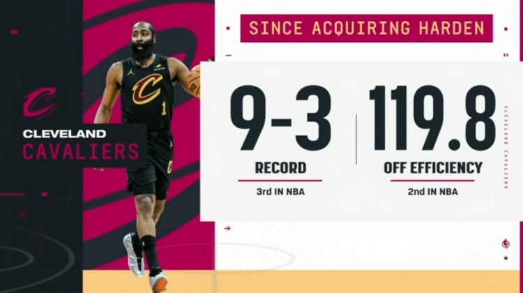 哈登加盟以来骑士战绩9胜3负,期间进攻效率119.8联盟第二!克利夫兰骑士