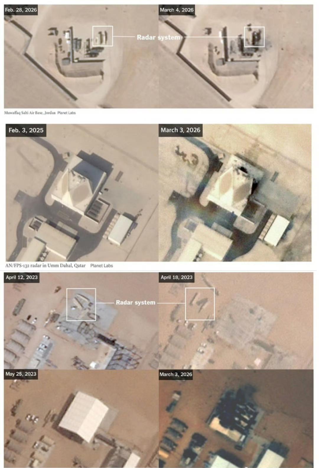 行星实验室的卫星照片证实了伊朗相关打击行动的成功: 约旦 Muwaffaq Salti Air Base:AN-TPY-2 雷达被摧毁。 卡塔尔Umm Dahal:AN-FPS-132 雷达受损。 沙特阿拉伯 Prince Sultan Air Base:AN/TPY-2 雷达(可能位于机库内)被摧毁。