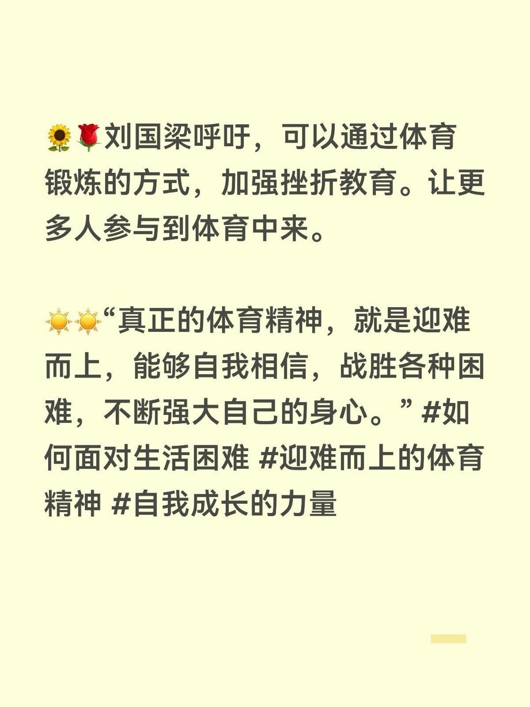 刘国梁建议加强挫折教育近日,全国政协委员刘国梁接受中国新闻周刊 采访时谈到。🌻🌹挫折教育是人生必经的重要课程,正如优秀运动员往往都承受过巨大压力,克服过种种困难。在生活学习中,遇到困难要勇于面对、敢于剖析,从而战胜困难,“其实你熬过去、挺过去了,你才会真正强大。”🌻🌹刘国梁呼吁,可以通过体育锻炼的方式,加强挫折教育。让更多人参与到体育中来。☀️☀️“真正的体育精神,就是迎难而上,能够自我相信,战胜各种困难,不断强大自己的身心。”