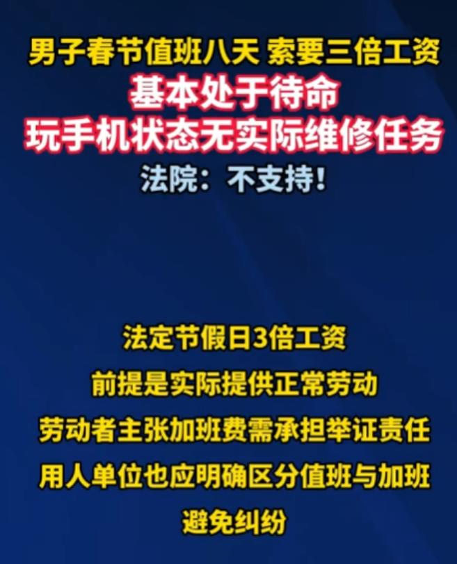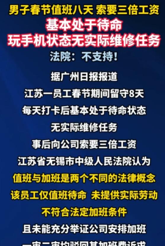 江苏无锡,一男子春节留守公司值班8天,满心期待3倍工资,结果收假后老板以他只是待命没实际维修为由拒发,损失6240元,男子多次索要无果后起诉了公司,法院驳回了男子的诉求,理由是值班和加班是有区别的!引发网友热议:法定假日不都是三倍工资吗?法律真不是这样的,值班和加班真有本质上的区别! 最近江苏无锡一则劳动纠纷,刷爆了全网,看完整件事,不少人都替当事人觉得委屈,可法院的判决,又让人不得不认清一个现实:法定假日的3倍工资,不是只要待在公司就能拿。 事情的主人公姓须,是无锡一家销售公司的机电维修工,2023年8月入职的,2024年春节,别人都回家团圆,须先生主动留守公司值班,一值就是8天,从正月初一到初八,整整一个春节假期,都没能陪家人。 他之所以愿意留下来,核心就是盼着法定假日的3倍工资,按照他的核算,这8天下来,能拿到6240元的工资差额,这笔钱对普通打工人来说,也不算小数目,算是对自己春节留守的一份补偿。 可没想到,收假复工后,须先生找老板要这笔钱时,却被泼了一盆冷水,老板直接拒绝发放,理由很简单:他这8天只是待命,压根没有实际开展维修工作,算不上加班,自然没有3倍工资。 须先生一下子就懵了,自己明明每天按时到公司打卡,全程在单位待命,放弃了和家人团圆的时间,怎么就不算数了?他多次找老板沟通索要,可老板始终态度坚决,一分钱都不肯给。 被逼无奈之下,须先生只能拿起法律武器,把公司告上了法庭,希望通过法院维权,要回属于自己的6240元,可让他没想到的是,一审法院直接驳回了他的诉求,给出的理由只有一个:值班和加班,本质上是两回事。 这事儿一出来,网友们彻底吵翻了,不少人都疑惑,法定假日上班,不就该给3倍工资吗?其实大家和须先生一样,都把值班和加班搞混了。 其实法律上,两者的区别很明确,只是很多打工人没仔细了解过,须先生的工作是机电维修,平时上班就是处理各种维修、救援任务,工作强度不小,但他春节值班的这8天,自己也承认,全程没有任何实际劳动。 简单说,加班是公司安排你在节假日继续干本职工作,和平时上班一样忙,甚至更忙,这种情况才会有3倍工资,而值班,更多是为了应对突发情况,保证公司正常运转,工作强度低,这种情况下就没有法定的3倍工资要求。 还有一点很关键,须先生起诉时,没能提供充分证据,证明公司安排他的是加班,反而承认了自己只是待命,而且公司也否认安排他值班,这也让他的诉求少了有力支撑。 说句实在的,须先生确实委屈,放弃春节团圆,在公司待了8天,最后一分额外补偿都没有,但法律讲究的是证据和事实,值班和加班的界限,容不得半点模糊。 这事儿也给所有打工人提了个醒,以后节假日被安排留守,一定要先问清楚,是值班还是加班,如果是加班,要保留好工作记录,如果是值班,也要提前和公司确认好值班待遇,避免像须先生这样,白白付出时间,最后却得不偿失。
