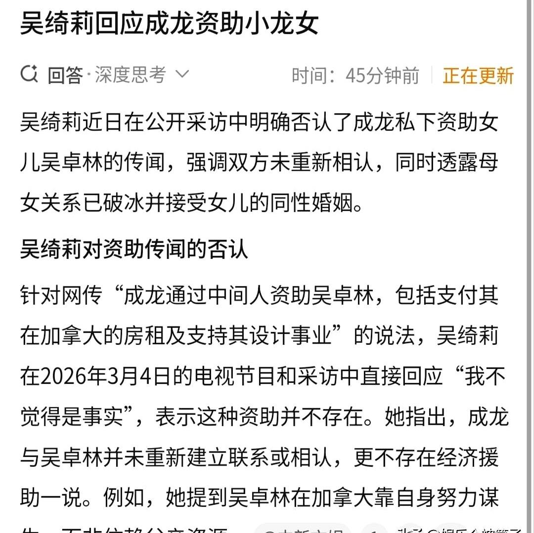 闹了半天,这事儿居然是假的? 吴绮莉最近公开回应了,直接否认了成龙私下资助女儿吴卓林的传闻。 她说的挺明白:根本没这回事,父女俩也没联系、没相认。 之前港媒不是爆料嘛,说成龙大哥偷偷帮吴卓林付房租、还给她介绍电影海报的活儿。 当时好多网友还挺欣慰,觉得总算有个当爸的样子了,一家人是不是要和解了? 结果……唉,又是空欢喜一场。 说白了,网络消息真不能全信。 吴绮莉一个人把女儿带大也不容易,现在吴卓林也长大了,靠自己生活总归是踏实。 日子嘛,过得开心比啥都强。 至于他们一家子的关系,看来还得继续等。 话说回来,你们觉得这事儿还有转机吗?