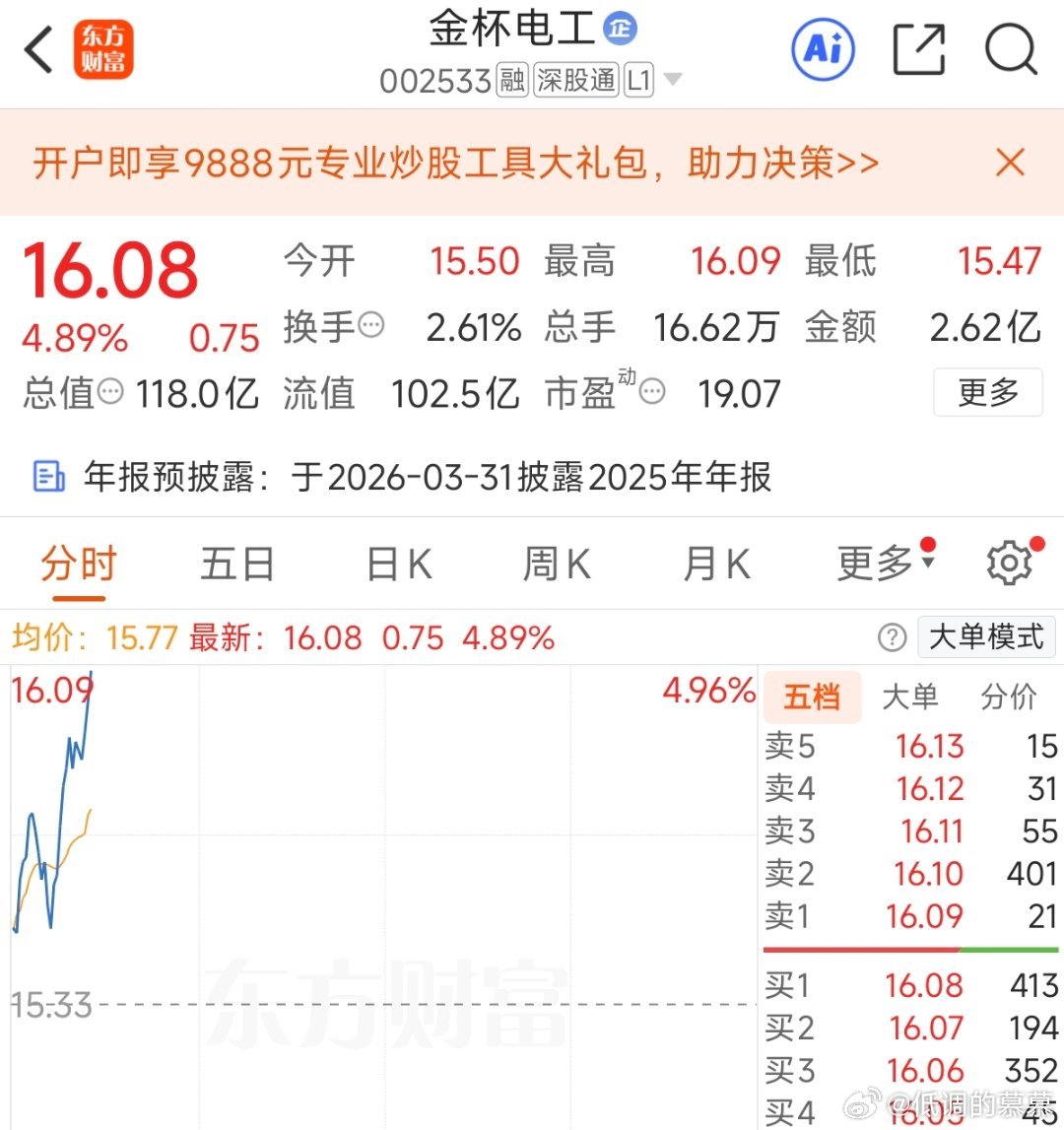 昨天午盘分享的V+小票$金杯电工 sz002533$ 开始发力,咱们要么不下手,下手必吃肉