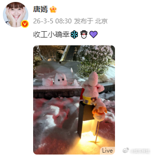 唐嫣收工拍的雪人今天早上唐嫣收工后,拍了粉丝为她堆的创意雪人照片,用“收工小确幸”这份雪天中的温暖互动。粉丝们的创意满分!唐总下班还能偶遇这么可爱的惊喜,真是冬日里的一抹亮色呀!糖糖与糖蜜真的很好 ,这波双向奔赴我收了!