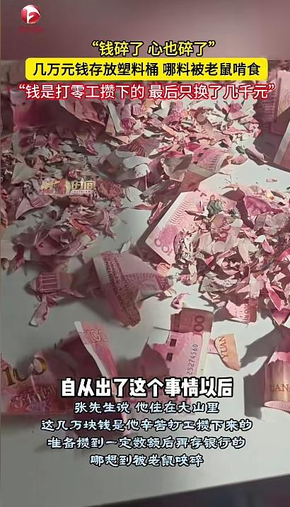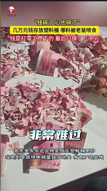 “成年人的崩溃往往就在一瞬间!”近日,云南昭通,一男子家住在大山中,便将平时打工赚来的钱存放在一个塑料桶里,不料,当男子打开塑料桶时,天都塌了!桶里的几万元现金被老鼠咬得面目全非,几年努力毁于一旦。网友:实在是太心痛了! 随着电子支付的普及,以及税务检查的需要,绝大多数公司都采用银行卡转账的形式进行工资支付。不过在一些偏远地区,纸币仍是支付工资的一种重要形式。 据媒体3月4日报道,张先生住在大山里,平时打工收到的报酬很多都是纸币。因为不想频繁的去银行,张先生便将赚来的纸币存进了一个塑料桶中,想着攒到一定的金额再去银行存上。几年下来,陆陆续续也有了几万块钱。 这一天,张先生再拿出存钱的塑料桶时,人都傻了。只见塑料桶上被咬出了一个洞,张先生顿感不妙,赶忙打开塑料桶,发现里面自己辛辛苦苦挣来的血汗钱,已经被咬的面目全非,不少都变成渣渣了。 张先生痛苦万分,赶紧整理了一遍,带着这些被咬坏的纸币去了银行。银行检查之后,发现绝大多数纸币破损十分严重,不符合兑换条件,最终只换回了几千元。张先生看着剩下的人民币碎屑,每日心如刀绞。 网友看后表示,虽然看着很心痛,但是却一点办法也没有。只希望他能够吃一堑长一智吧。纸币一定要保存好,毕竟那都是自己拿命辛苦赚来的。就算不能及时存到银行,也要找个安全的地方妥善保存,做好防火防潮防蛀咬措施。 信息来源:《钱碎了 心也碎了”,几万元钱存放塑料桶,哪料被老鼠啃食。》AHTV第一时间