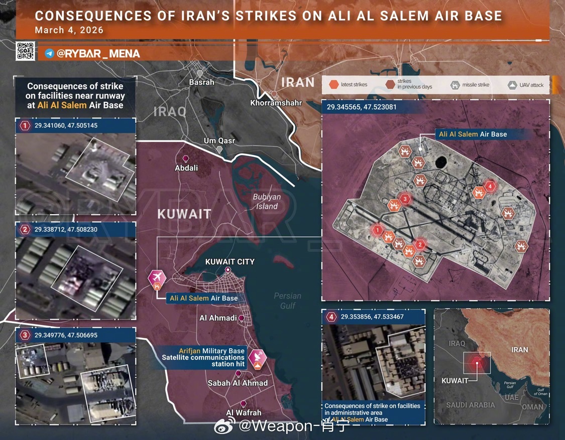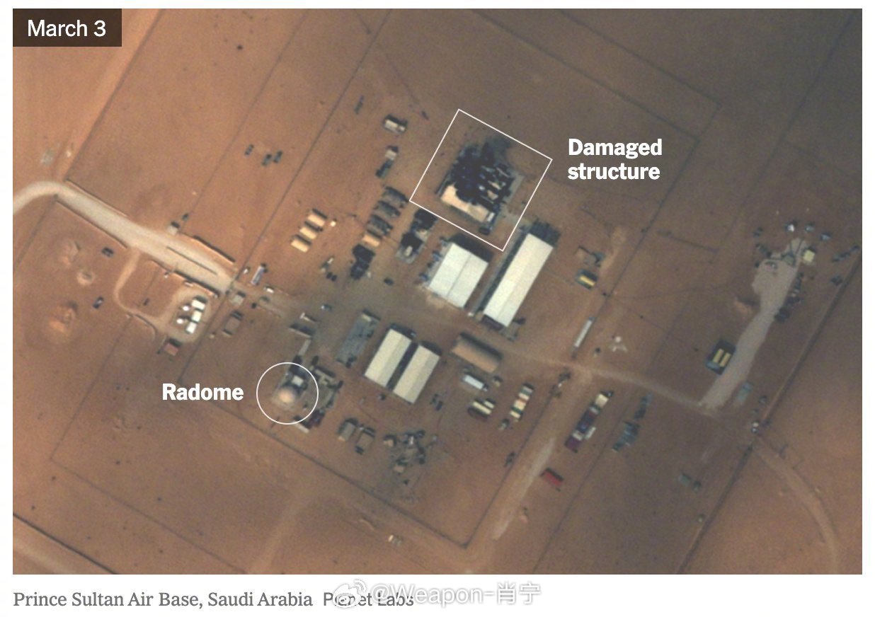 烽火问鼎计划美以伊冲突 新的卫星图像证实了几项高价值的美国资产在周末被伊朗袭击摧毁或损坏。伊朗摧毁了:• 2个AN/GSC-52B雷达(巴林)• 3个radomes(科威特Arifjan基地)• 1 AN/TPY-2 THAAD雷达(阿联酋)• 1 AN/TPY-2 THAAD雷达(约旦)• 1 AN/FPS-132雷达(卡塔尔)•+8个与卫星通信基础设施相关的建筑/结构(科威特)•雷达罩附近的1个地点可能被AN/TPY-2雷达击中(沙特阿拉伯苏丹王子空军基地)科威特的阿里·萨利姆基地也很有趣,因为它仍然有1991年波斯湾第一次战争期间反掩体弹药袭击的痕迹。因此,一些“命中”物体已经处于这种状态很长时间了。然而,损害仍然非常严重,并且有增加的所有先决条件。据科威特机构称,178枚弹道导弹和384架无人机被拦截,碎片落在基地。