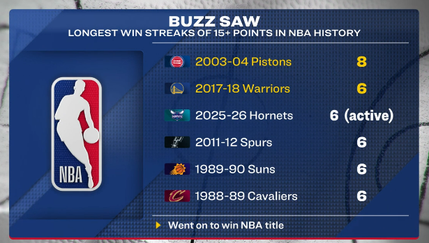 此役后,黄蜂已经连续6场比赛赢对手至少15分,和18年勇士并列历史第二长。