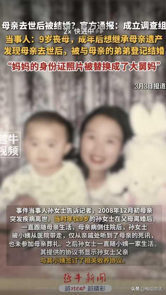 河北石家庄,九岁女孩丧母,10年后发现去世的母亲竟然“再婚”了!结婚对象居然是自己亲舅舅,更不可思议的是结婚证上母亲的照片是大舅妈,母亲留下的遗产更是不翼而飞。母亲离世后,女孩被小姨领养,小姨是否知情此事…. 当事人孙女士表示,在自己九岁时,也就是2018年11月,母亲被查出来肝有问题,那时父母早已离婚,自己母亲是做生意的,对自己非常疼爱。 那时孙女士只有九岁,既照顾不了母亲也做不了决定,还正是无忧无虑的年纪,当时舅舅和小姨赶来照顾。孙女士没想到的是舅舅和小姨这一来就是长达十年的欺骗。 当时舅舅和小姨说是带她妈妈去北京,做更好的治疗,她信了,没想到最后却是带妈妈回了河南老家,没看两天就强行带妈妈出了院。 12月1日到12月3日前后真的不到两天,3号出院当天孙女士妈妈就离世了。 孙女士表示当时老家的医疗条件并不好,但她妈妈很有钱,完全可以去北京寻找更好的机会,可舅舅和小姨从她家里拿了钱却没有履行承诺。 孙女士母亲离世后,小姨领养了孙女士。 12月17日,有人以孙女士母亲的名义委托小姨卖掉了母亲的房产。 同时孙女士母亲的其他店铺,珠宝,股权等都被做了公证登记委托管理,而这些年仅九岁的孙女士一无所知。 直到2018年孙女士考上大学,成年后,前去办理遗产继承,公证人员却告诉她,其母亲名下仅剩一件商铺,并且孙女士并不是母亲唯一子女。并且,孙女士的母亲在2019年12月25日办理了结婚登记,目前孙女士做不了遗产继承公证。 听到这一消息孙女士不敢置信,自己母亲2018年离世,时隔一年后再次结婚,小说都不敢这么写。 震惊之余,孙女士也开始四处询问,查证。孙女士表示,很显然舅舅与小姨知情并且一直在欺骗自己。 第一母亲未销户,关于母亲再婚,孙女士发现是大舅妈冒充,身份证上只有名字和身份证号是母亲的,地址和照片都是大舅妈。 知道这些孙女士是悲痛的气愤的,亲舅舅连病逝的亲姐姐都不放过。何其可悲。 第二关于遗产继承公证,因为母亲被冒充再婚,其关系下不仅一位子女,公证处不认,做不了遗产继承的公证。 目前孙女士已在联系鲁山县民警正在调查中。 首先,一个离世的人是不具备任何结婚资格的。 根据《民法典》第十三条规定,孙女士舅舅与孙女士母亲结婚不具备法律效力。 《刑法》第二百八十条规定,伪造变造身份证件的,可处三年以下有期徒刑、拘役、管制;情节严重的,处三年以上七年以下有期徒刑,并处罚金。 另外,以非法占有遗产为目的,通过伪造委托书、虚假婚姻登记等手段,试图将他人财产据为己有,且数额巨大,就构成诈骗罪。 本事件中,小姨擅自出售孙女士母亲的房产并侵吞售房款,涉嫌侵占罪,但需要孙女士自诉。 如果在调查中发现有公职人员利用职务便利提供帮助,还可能涉及滥用职权罪或玩忽职守罪。 伪造的配偶,也就是孙女士的舅舅,如果被纳入继承程序,将严重侵犯孙女士的法定继承权。 舅妈冒用孙女士母亲的姓名、肖像,侵害了她姓名权、肖像权、名誉权。孙女士有权要求她返还财产、赔偿损失,并主张精神损害抚慰金。 最后,舅舅,舅妈,小姨以及其子女在这件事中都扮演什么角色,网友们觉得呢?