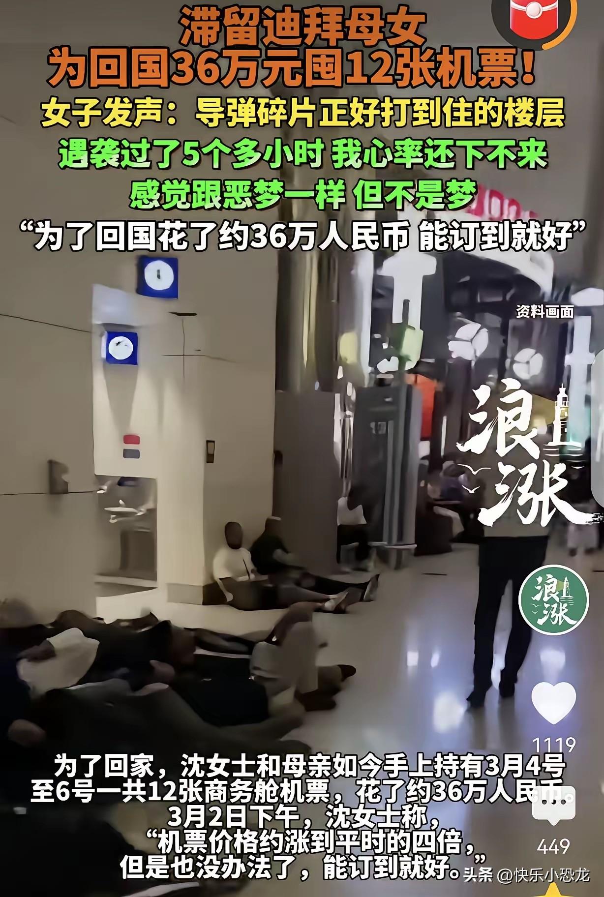 保命重要!一女子带着母亲在迪拜旅游,遭遇导弹碎片击中酒店楼顶,吓得她拉着母亲狂奔逃命,5小时心率都降不下来。为了尽快回国,她居然花了36万囤下12张机票,赶上哪班算哪班,只想着:只要能保命,什么都顾不上了! 女子本来是带母亲出国旅游散心,提前做好了攻略,还订好了3月7日回国的机票。 谁知道突然遇到危险,防空警报一响,导弹碎片就砸到了酒店楼顶,当时场面特别吓人,她第一反应就是带着母亲赶紧跑。 逃到安全地方后,她一直心慌,整整五个小时心跳都降不下来。 身在国外,身边又是最亲的妈妈,她一刻都不想多待,脑子里只有一个想法:就是想尽一切办法,尽快带母亲回国。 那时候机票已经暴涨四倍,还经常临时取消。 她不想赌运气,直接把3月4日到6日能回国的航班全买了,母女俩一共12张票,花了36万。 在她心里,平安回家比什么都重要。 很多人觉得遇到危险,钱再多也比不上命重要。也有人觉得没必要买这么多票,可以再等等看。 但只有亲身处在那种环境里,才知道害怕和无助是什么感觉。 我们平时出门旅游,图开心,图安全,谁也不想遇到意外。这件事也提醒大家,在外一定要把安全放在首位。 尤其是带着家人,平安比什么都珍贵。 我特别佩服这位女子的果断,钱没了可以再赚,亲人的安全却等不起。在慌乱时刻还能护住母亲,这份清醒和担当,比花出去的36万更有价值。 各位读者你们怎么看?欢迎在评论区讨论。
