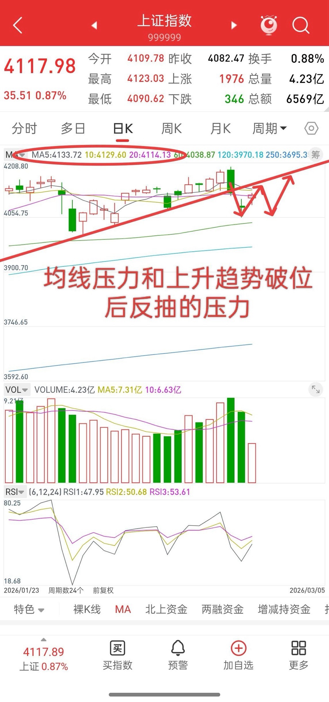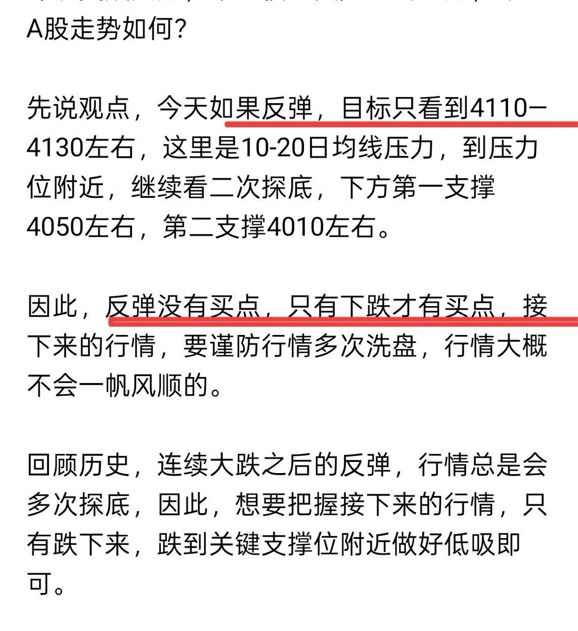 今天早上盘前提示,反弹只看到5-10-20日均线压力附近,大概4110-4130左右,压力位附近不做多,反弹没有买点。