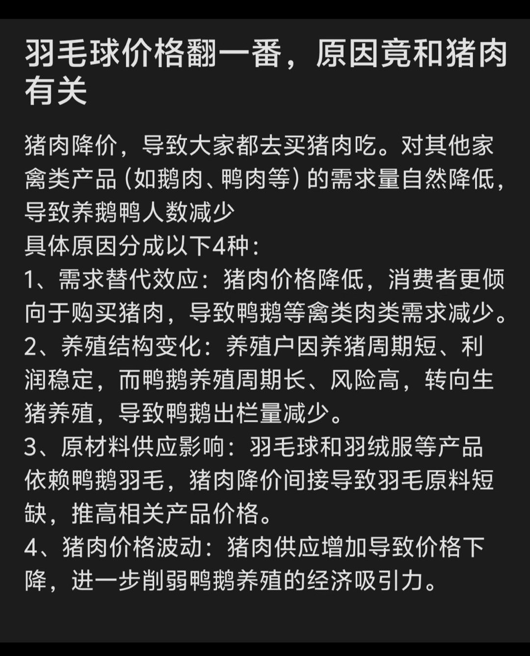猪肉涨价也会影响羽毛球市场价格羽毛球价格翻一番,原因竟和猪肉有关?猪肉降价,导致大家都去买猪肉吃。对其他家禽类产品(如鹅肉、鸭肉等)的需求量自然降低,导致养鹅鸭人数减少,羽毛制品跟着减少,但国内对羽毛球的需求量大,羽毛球自然涨价! 2000元买羽毛球现在入手能省500元