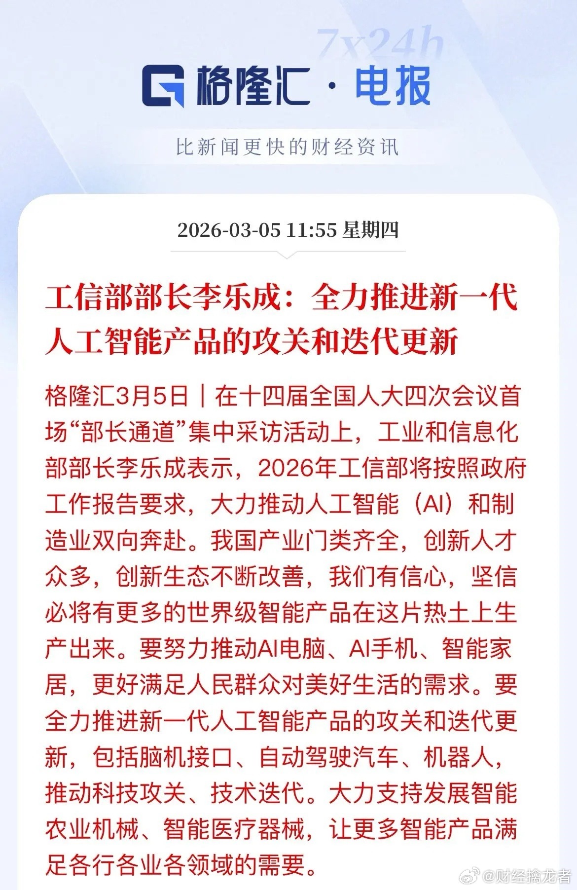 今天,工信部部长李乐成在“部长通道”上放话了:2026年将大力推动人工智能与制造业深度融合,全力推进新一代人工智能产品攻关迭代。
