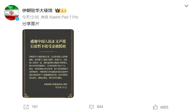 太有意思了,伊朗驻华大使馆今天在社交媒体上发文说“感谢中国人民正义声援,目前暂不接受金融援助”。 这句话背后太有意思了,前半句感谢的话,其实就是回应很多网友对伊朗的支持,最近很多网友甚至在伊朗驻华大使馆账号下面出谋划策,帮助伊朗搜集各种目标信息。而后半句也说得很巧妙,用“暂不接受”这个词就给今后留下了口子,万一后面伊朗真的不行了,可能还真的会开放资金援助的口子。 这一次伊朗在我们的网络平台上是占据了优势,美国、以色列获得的网络舆论支持相对弱了一些,如果放在十年、二十年之前,美国、以色列肯定更有舆论优势,那个时候主导网络舆论声音更多是一些偏向于西方的网络大V,但最近五六年以来,这些亲西方的网络大V失去了公信力。 我认为美国、以色列这次对伊朗的军事打击可能对伊朗来说也不见得是坏事,可以推动伊朗内部改革,如果伊朗依然像之前那样,伊朗是不会有前途的,过去几十年伊朗经济越来越差,内部问题太大了,或许只有外部力量的冲击才能推动伊朗反思反省。