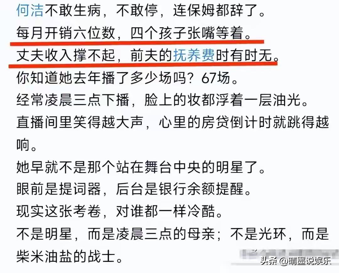 刚开始还好奇,为何39岁的何洁素颜直播看着比同龄人显老十岁? 直到想起她有4个孩子要养,前夫的赡养费也很少及时到位,现任丈夫撑不住每月六位数的家庭开销,所以整个家基本全靠何洁一人强撑。 去年直播67场,她兢兢业业,生怕自己掉链子,经常凌晨三点下播,在如此高强度的工作状态下自然容易变老。 她再也不是舞台上年轻洒脱的从容模样,而是为了家人努力奋斗的超人妈妈。