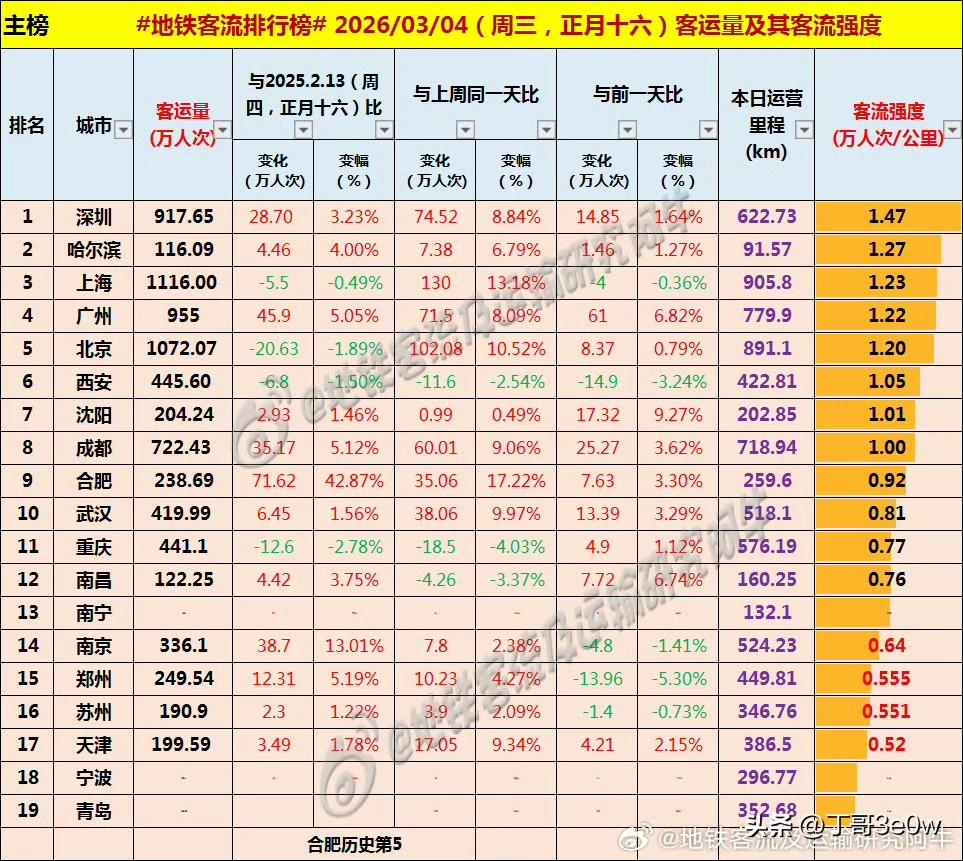 合肥地铁客流量昨日超238万人次,创历史第五高。[呲牙][呲牙][呲牙] 爆料 身边事 合肥 周三 2026年3月4日 星期③ 全国重点城市轨道交通客流量排行榜: 上海:1116.00万 北京:1072.07万 广州:955.00万广州身边事 深圳:915.65万深圳地铁 成都:722.43万 西安:445.60万西安身边事 重庆:441.10万重庆地铁 武汉:419.99万武汉身边事 南京:336.10万南京爆料 郑州:249.54万 合肥:238.69万合肥地铁 沈阳:204.24万沈阳地铁 天津:199.59万天津身边事 苏州:190.90万 青岛:122万+青岛爆料 宁波:122万+宁波地铁 南昌:122.25万 哈尔滨116.09万哈尔滨爆料 南宁:100万+