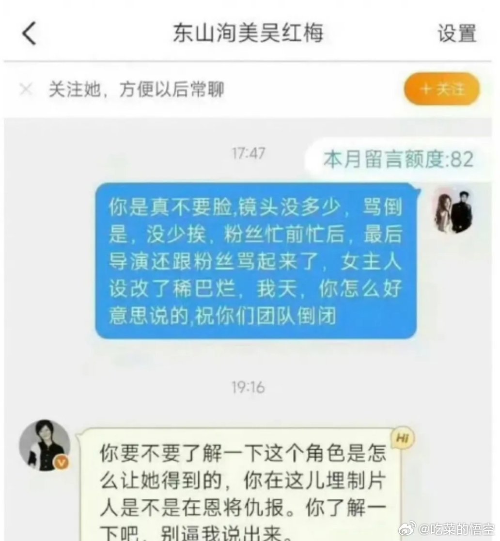 这时候,制片人吴红梅在回复私信时直接称:“你要不要了解下这个角色她是怎么得到的?你在这儿埋制片人是不是在恩将仇报。别逼我说出来。”