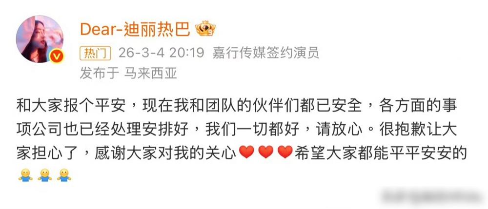 中东的防空警报逼停了漫天航班,迪拜机场延误大屏疯狂闪烁红灯。顶流女星独自滞留在炮火边缘的转机大厅,而她的随行团队此刻正舒舒服服坐在直飞巴黎的头等舱里喝气泡水。你敢信这是迪丽热巴刚刚经历的魔幻生死局? 奇葩行程直接搅黄了原定3月3日的迪奥巴黎大秀。昨天她自己捏着手机敲字报平安,发布动态的IP赫然挂着马来西亚,这才算彻底撤出高危地带。你随便找个圈内朋友打听打听,谁家一线的跨国行程会安排艺人去高危地带走经济转机路线,反倒让工作人员安安稳稳直飞目的地? 往回翻几天日历你就全懂了。2月26日那天,她刚熬完长达十三年的嘉行卖身契。这位曾单肩扛下老东家三成营收的摇钱树,终于决定带走十一个全球代言自己单干。前脚刚交出财务自由的底牌,后脚就遇上这种能写进内娱反面教材的夺命航班安排。粉丝指着鼻子骂老东家最后还要恶心人,这事搁在咱们酒桌上聊,谁听了不得连连冷笑。 好在她终于砸碎了十三年枷锁,百万注册的新工作室已经开机运转。她撕掉的不是一张飞往巴黎的转机机票,而是任人摆布的吸血剧本,她迎来的不是一句干巴巴的迟到道歉,而是完全属于自己的大女主时代。