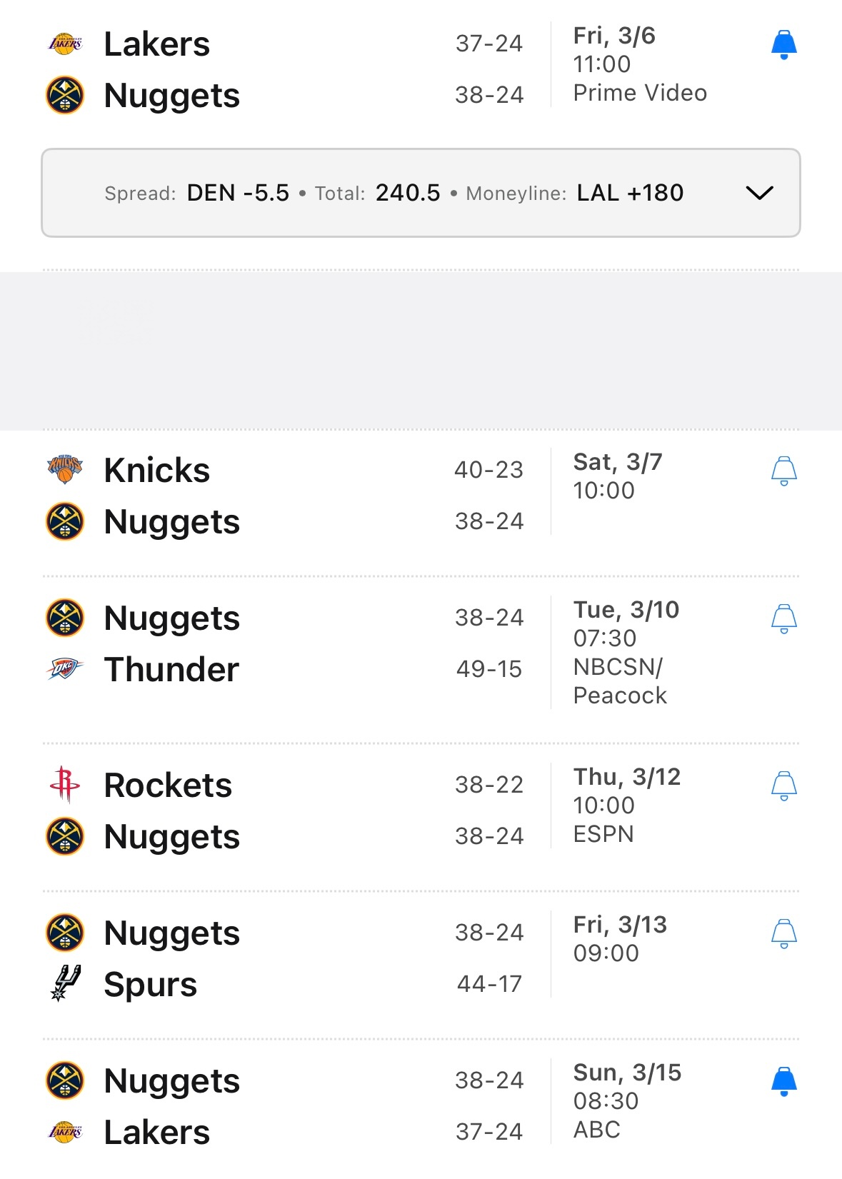 掘金未来六场比赛将对阵:湖人、尼克斯、雷霆、火箭、马刺、湖人。
