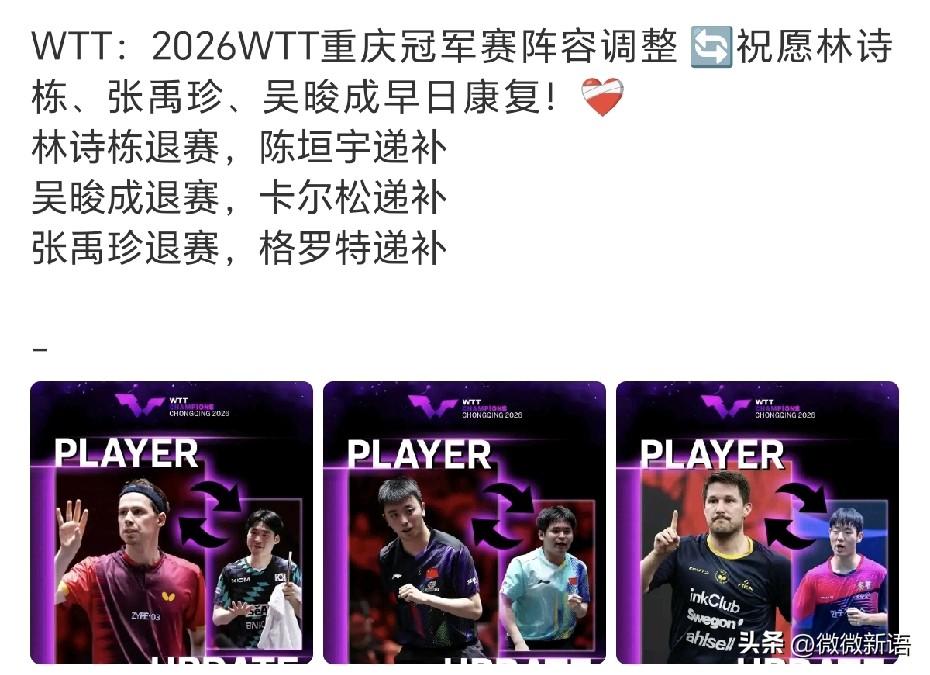 早田希娜也没有参加重庆冠军赛,应该是要全力备战4月份的澳门世界杯了。在刚刚结束的新加坡大满贯赛,女单1/4决赛时,早田希娜是2-4输给了莎莎,不过早田希娜和张本美和拿到了大满贯赛女双冠军,看早田笑的多开心。 不过新加坡大满贯赛早田希娜确实打的好,她肯定也下功夫研究蒯曼了,和莎莎打的时候拼的也很凶,这下又退了重庆冠军赛,肯定是想更好的准备世界杯的比赛了。 重庆冠军赛将于3月10日开赛,今天看到张禹珍、吴晙诚因伤退赛了,看来吴晙诚上次在金奈比赛伤的不轻啊,张禹珍在新加坡大满贯赛时,也是因身体不适准备退赛,但是又怕影响自己的积分,所以坚持打完最后一局。国乒是林诗栋退赛了,陈垣宇递补参赛,林诗栋这段时间也一直有伤病,其实早就该休息一下了,那下次再看林诗栋打比赛就是世界杯了。 现在很多外协选手都是有选择的参加比赛,林昀儒是没有参加亚洲杯的比赛,他好好准备新加坡大满贯赛,新加坡大满贯赛他首次打进大满贯赛的决赛,拿到了亚军,运动员确实是需要足够的休息,才能让自己保持最好的竞技状态。