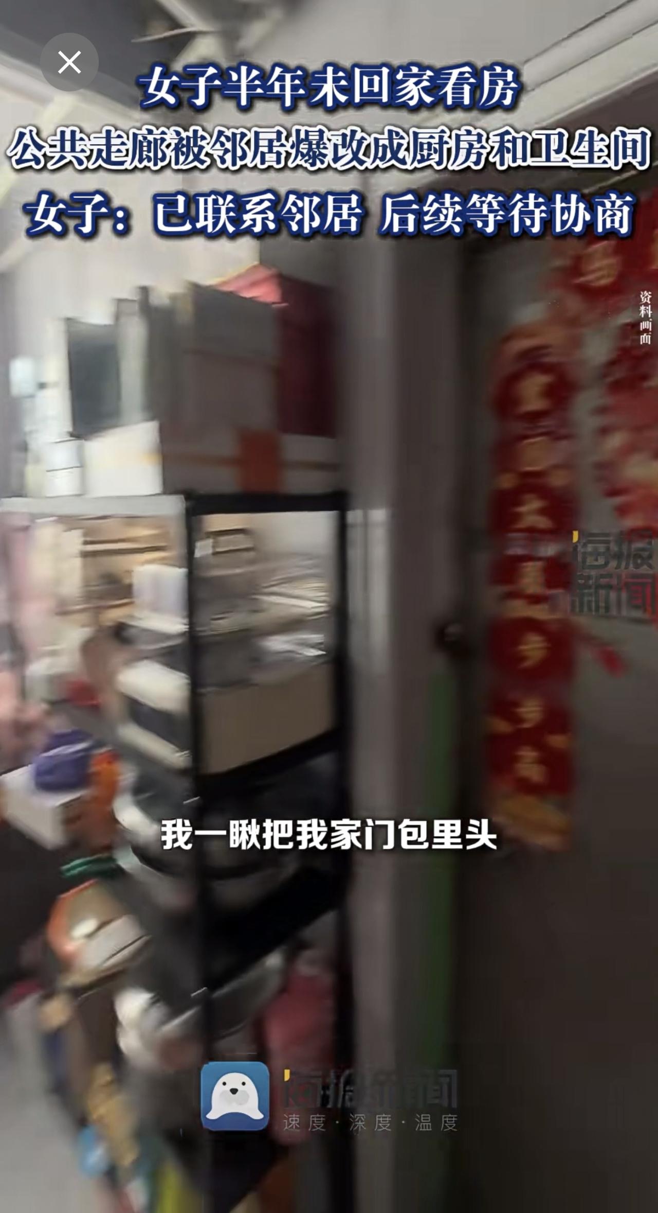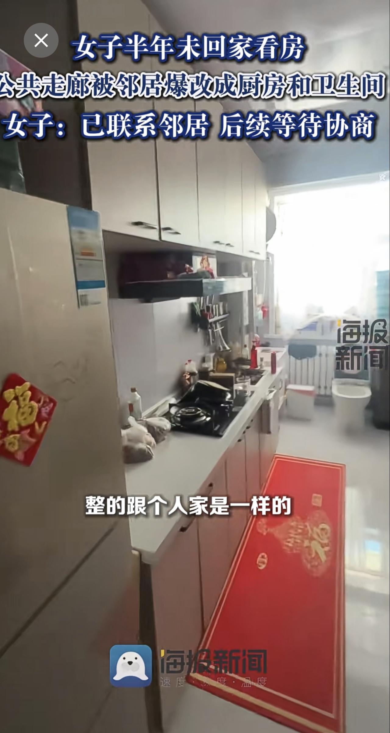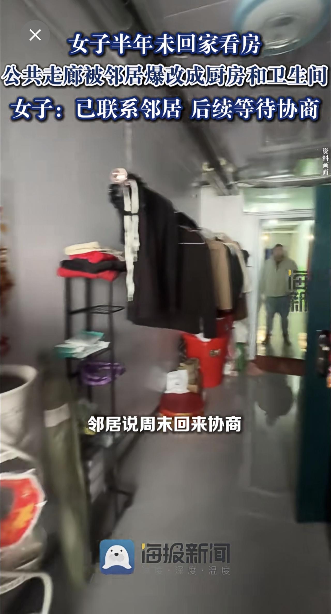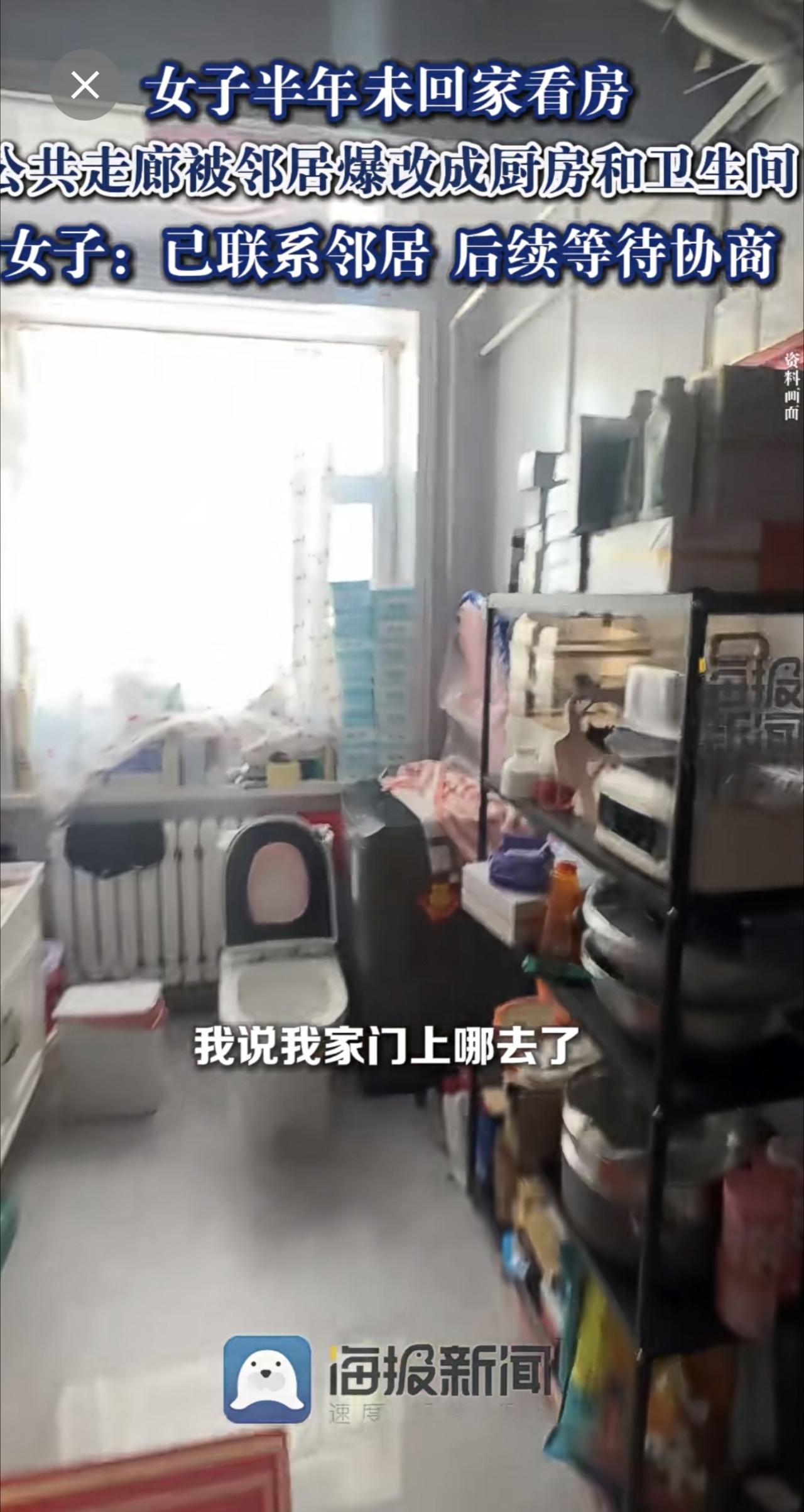 女子半年未回家看房,公共走廊被邻居爆改成厨房和卫生间:已联系邻居,后续等待协商。