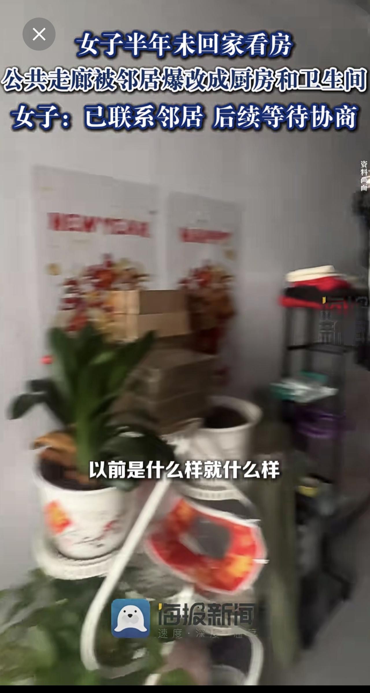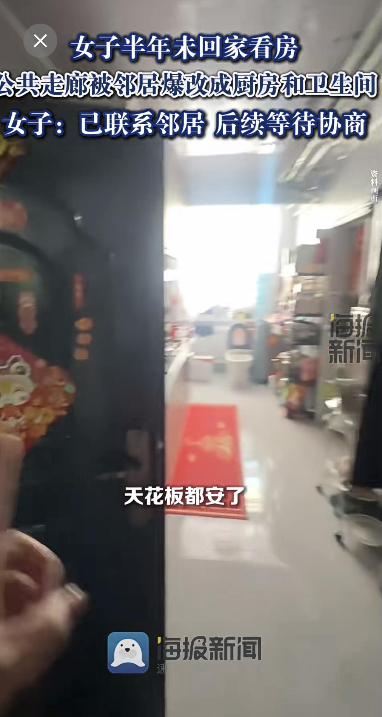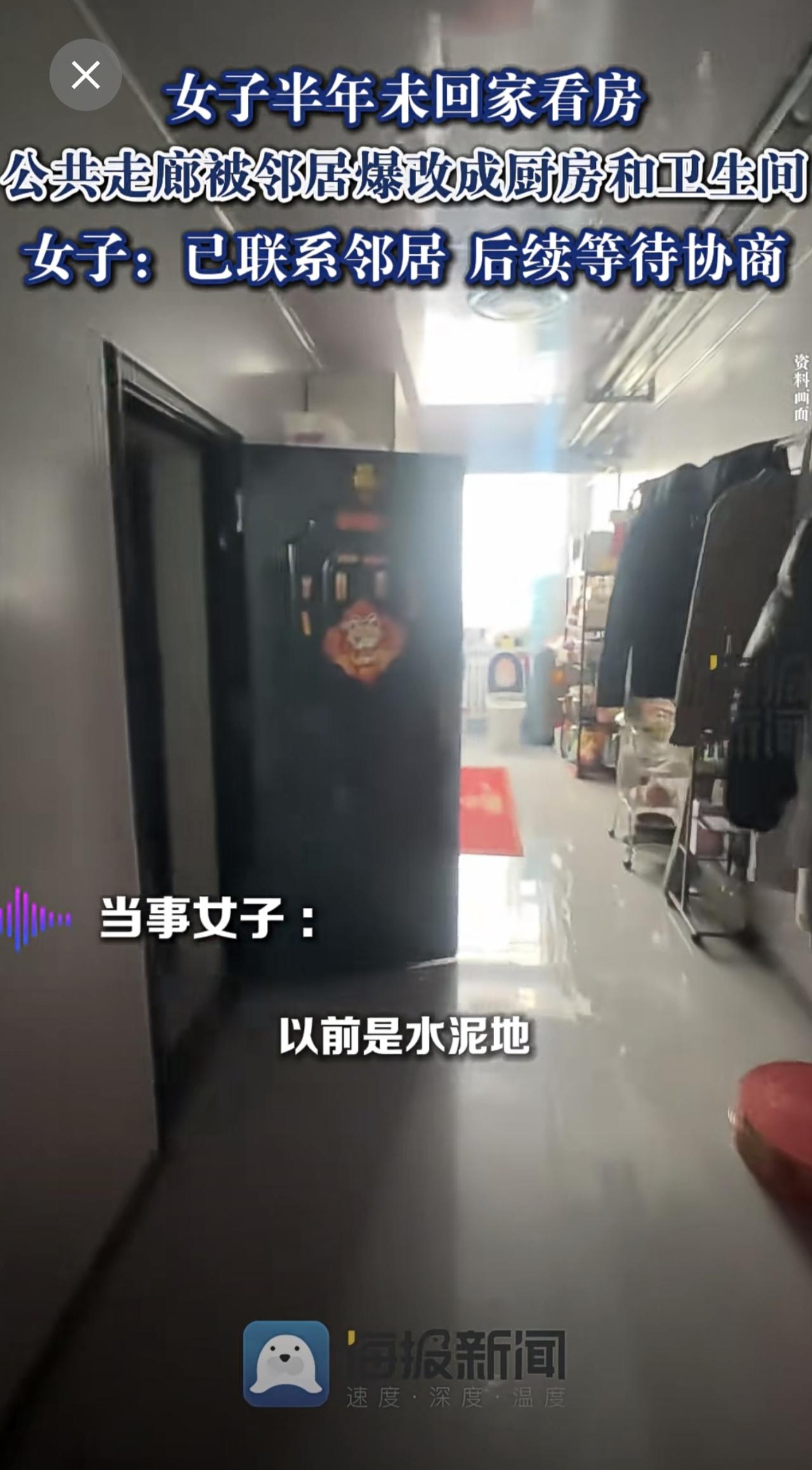 女子半年未回家看房,公共走廊被邻居爆改成厨房和卫生间:已联系邻居,后续等待协商。