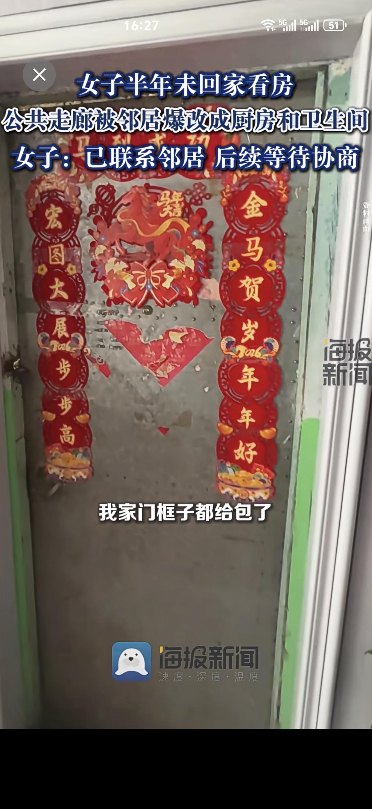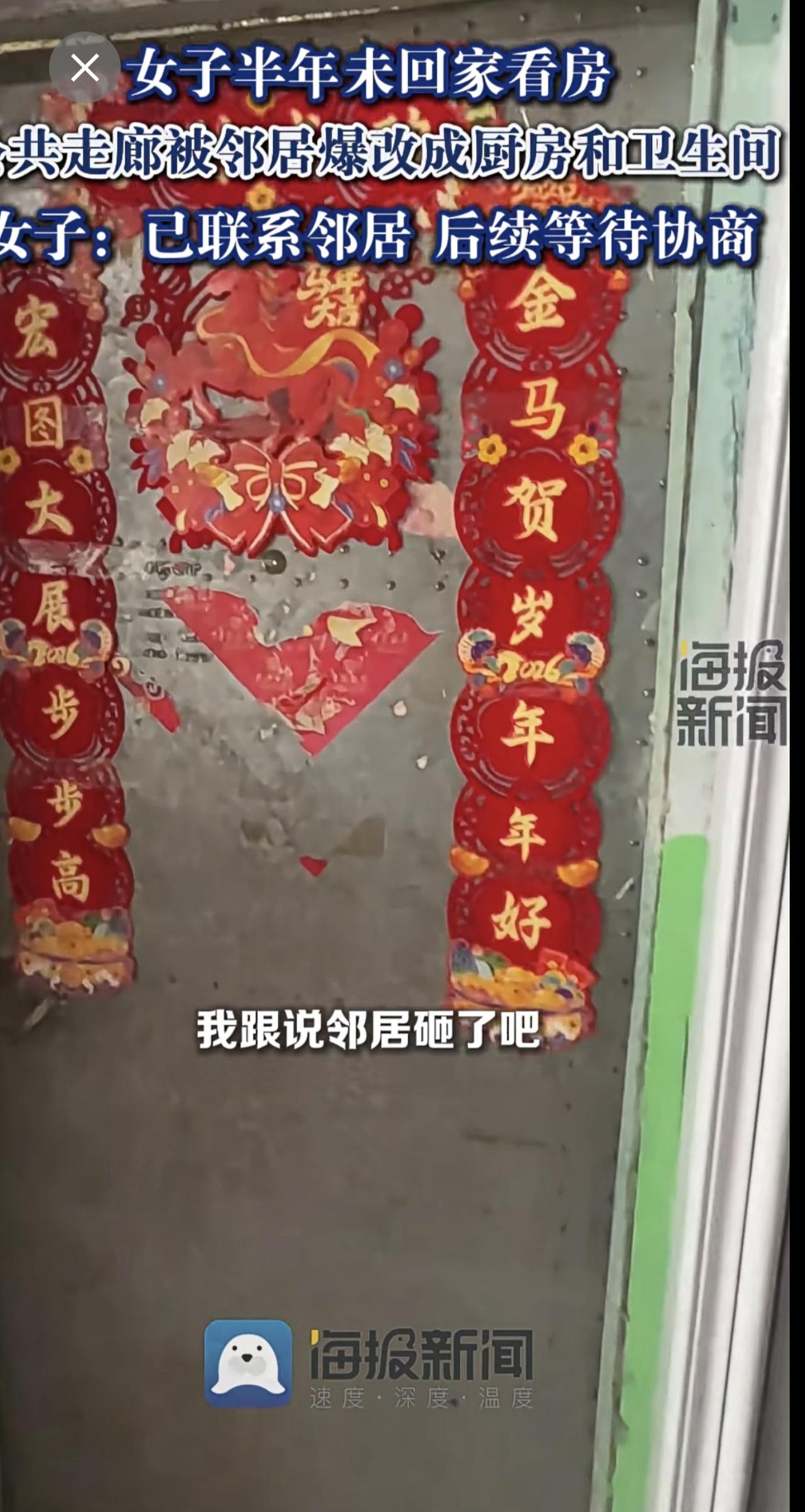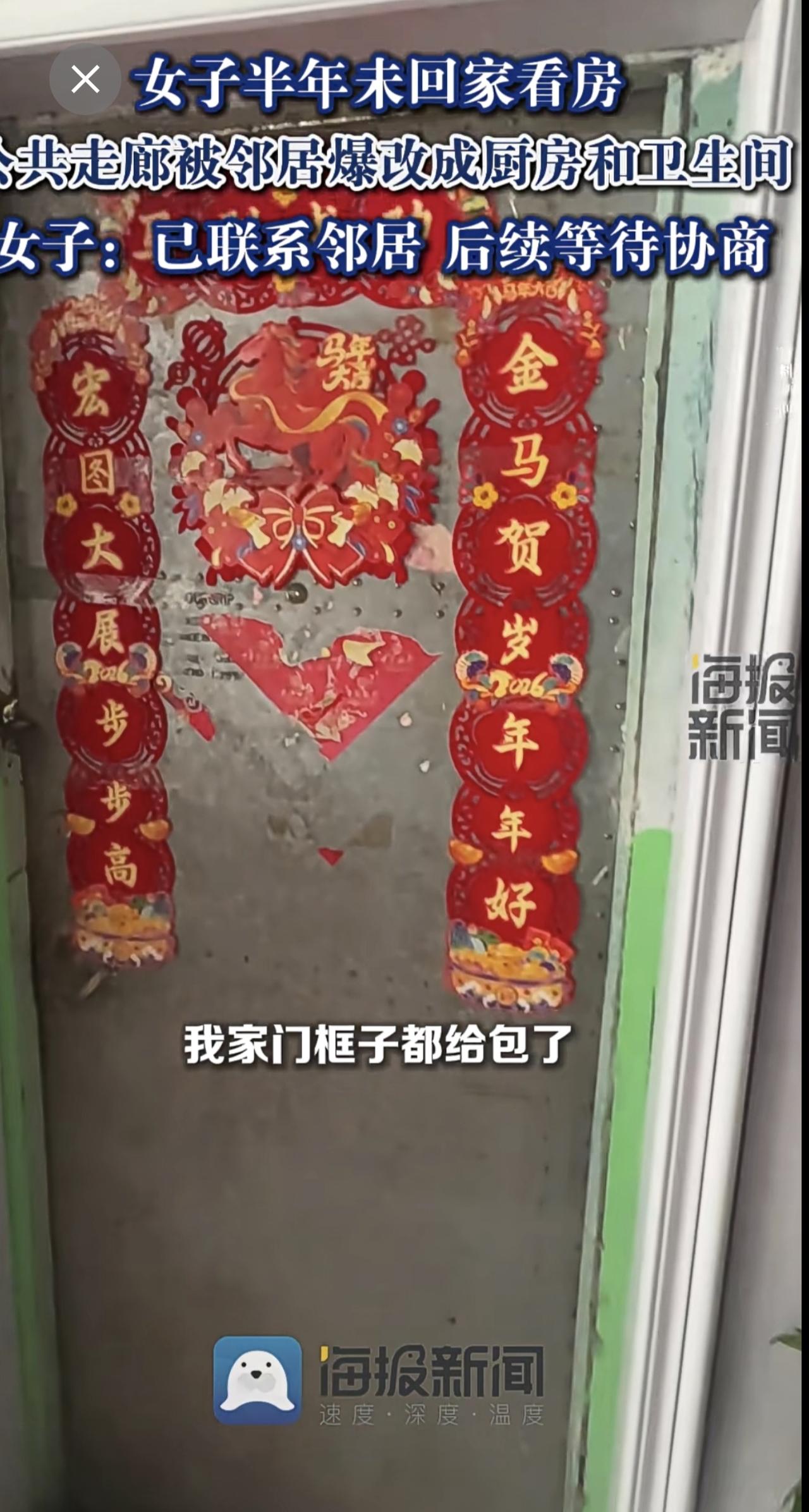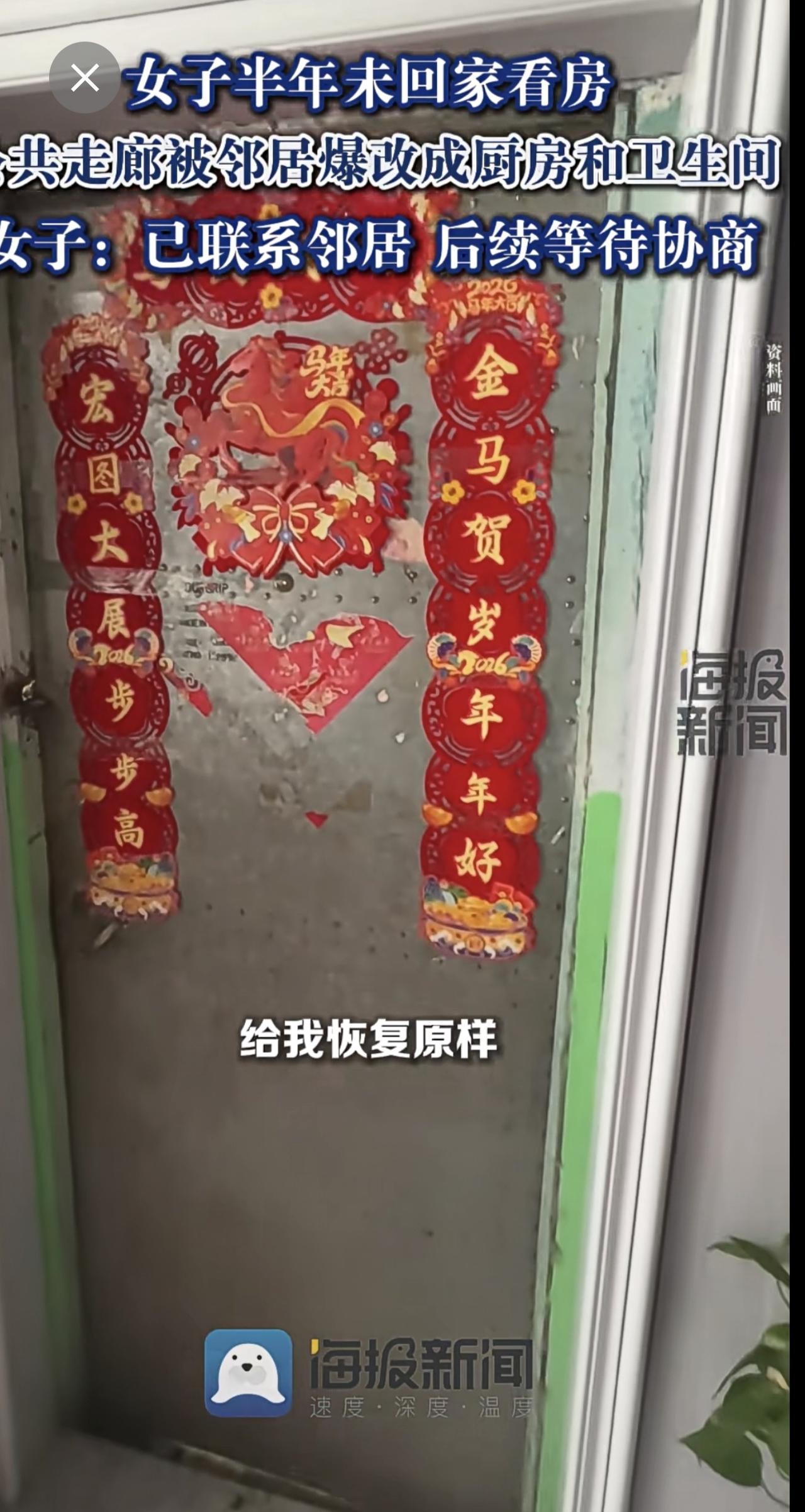 女子半年未回家看房,公共走廊被邻居爆改成厨房和卫生间:已联系邻居,后续等待协商。