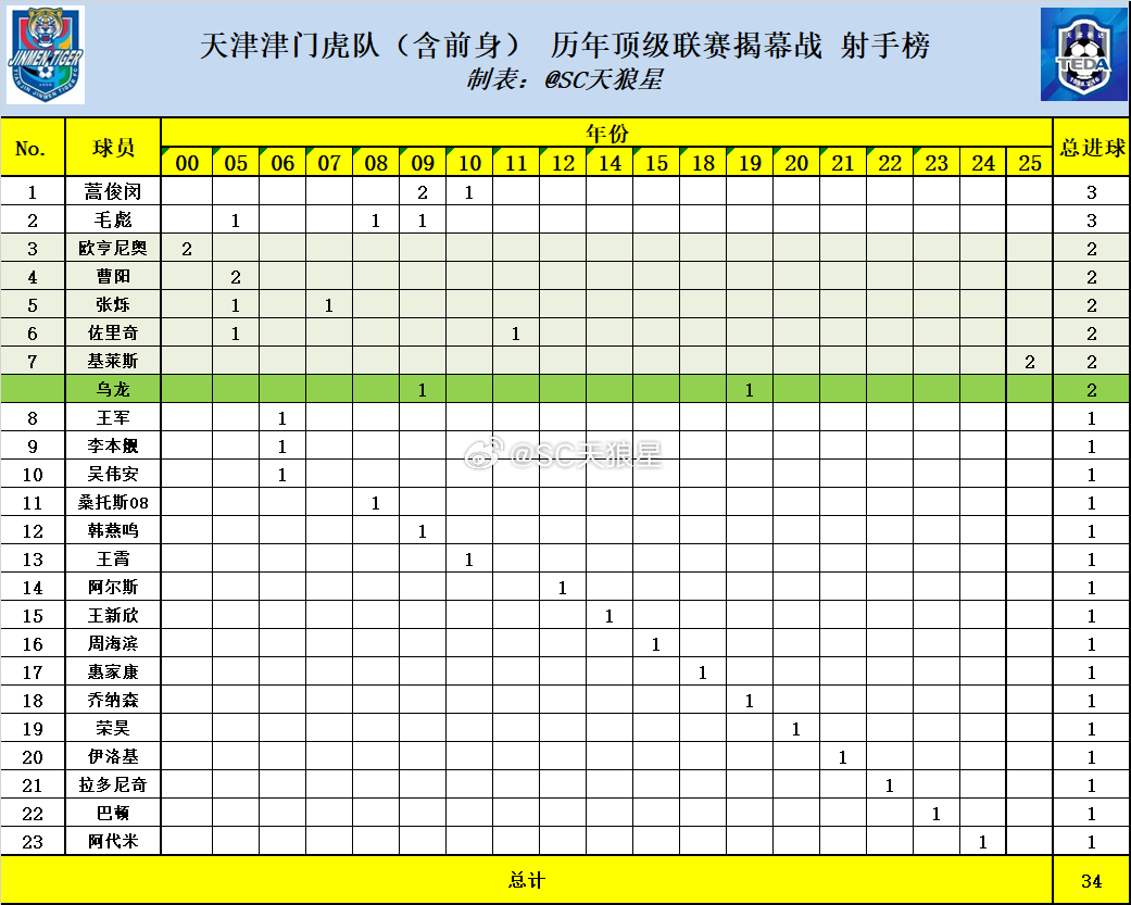 职业化以来,天津津门虎(含前身)历年顶级联赛揭幕战 射手榜。蒿俊闵和毛彪并列榜首