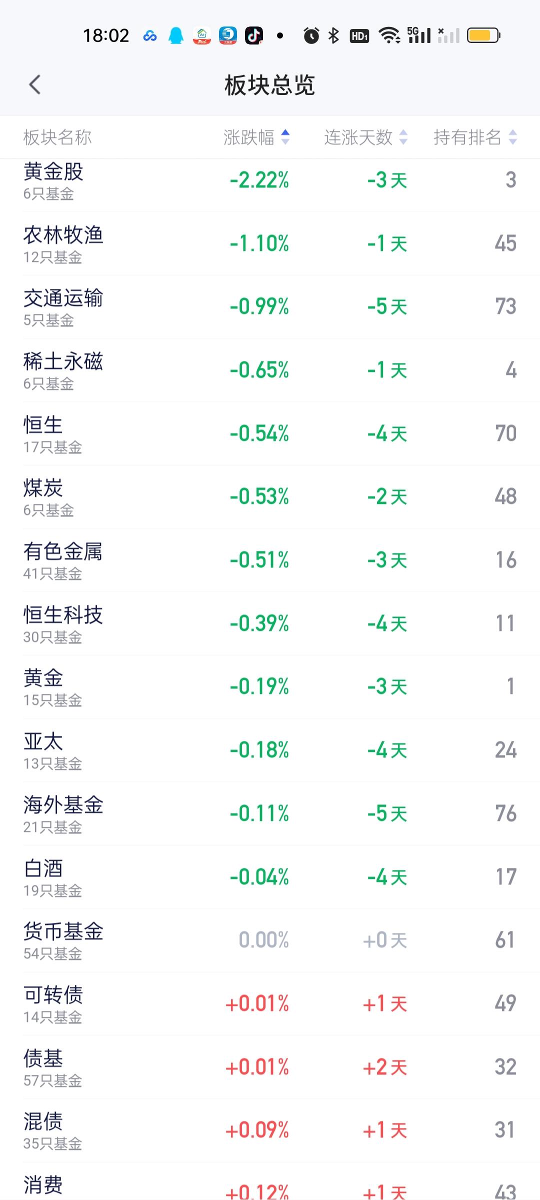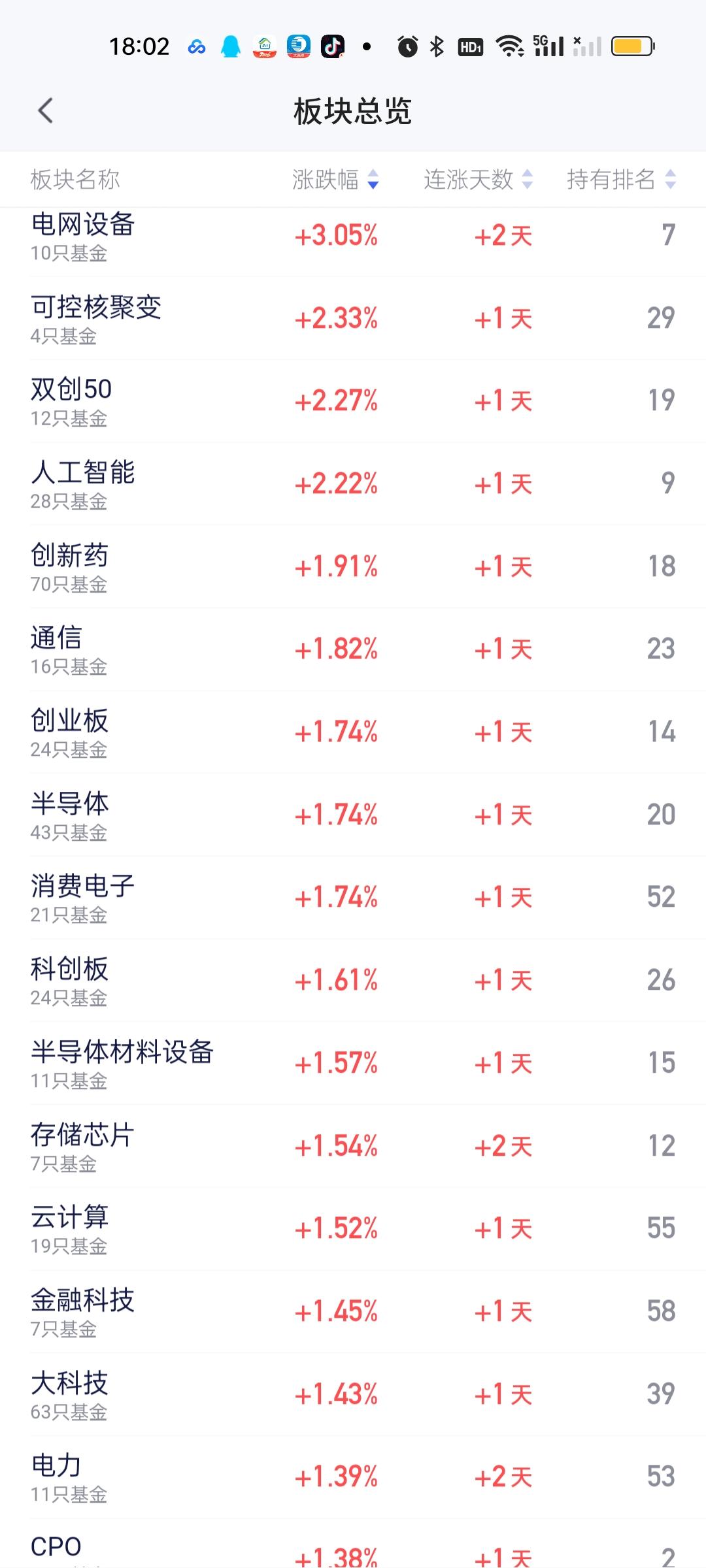 尾盘尽管下杀了一些,但今天红的板块依旧比绿的多了很多。只不过没有涨得特别好的板块出现。涨幅方面,电网设备,双创50,人工智能,创新药,通信,创业板,半导体,消费电子涨幅居前,跌幅方面,黄金股,农林牧渔,交通运输,稀土永磁,恒指,煤炭,有色金属,恒科跌幅靠前。