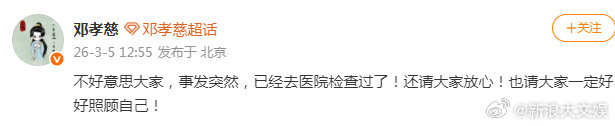 邓孝慈报平安邓孝慈发文报平安 邓孝慈身体不适缺席剧宣活动,他发文报平安:“不好意思大家,事发突然,已经去医院检查过了!还请大家放心!也请大家一定好好照顾自己! ”