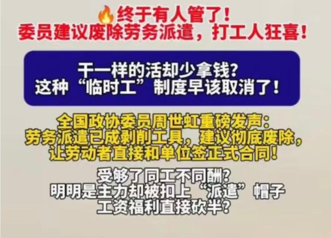 劳务派遣,为何让很多打工人倍感无奈? 劳务派遣或许是很多普通劳动者心中的真实痛点。扣上“派遣”帽子,工资福利直接砍半? 这项制度早已偏离了辅助性、临时性、替代性的设计初衷,渐渐成为企业降低用工成本的常见方式。 职场中不少真实经历让人唏嘘:同样的岗位、同样的付出,派遣员工与正式工待遇差距悬殊。 有人长期坚守同一岗位,薪资却少几千元,社保按最低标准缴纳,没有福利、没有晋升通道; 同样辛苦加班,却要被劳务公司层层抽取报酬,甚至面临“你不干有的是人干”的无奈处境。也有派遣员工历经艰难维权,才追回合理薪酬。 同工不同酬、保障不对等,长期下去难以真正保障劳动者权益。这样的用工模式,是否需要进一步规范与完善,才能让劳动者得到应有的尊重与公平?工作 派遣制用工 劳动派遣制度 第三方派遣员工
