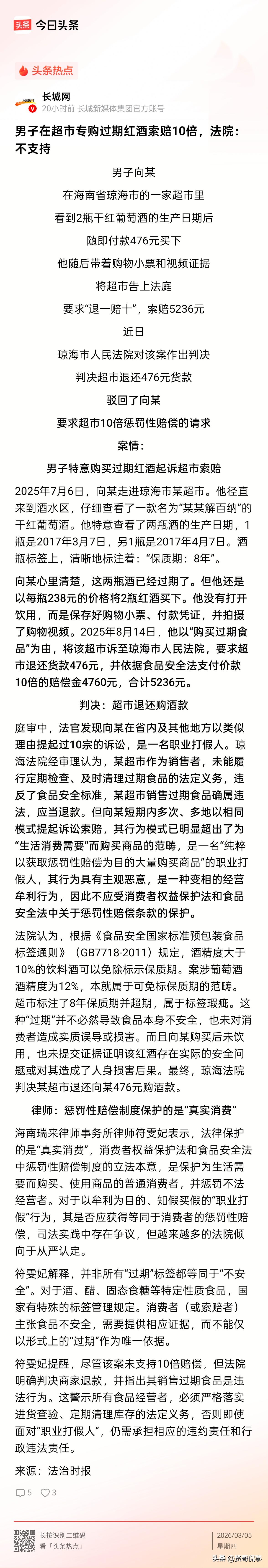 “踢到铁板了!”海南琼海,男子来到超市花476元,买了两瓶葡萄酒,在此过程中还全程录下了视频。随后,男子便以两瓶酒已过期为由,在当地法院起诉,要求超市退一赔十,赔偿5236元。法院经调查发现,男子这样做已不是第一次,在其他地方起诉案件多达10余宗,明显目的不纯。 2025年7月6日,向某在海南琼海一家超市里,像往常一样逛着货架,只是他的目标很明确,不是购物,而是找“茬”。 向某走到酒水区,拿起一款解葡萄酒的标签进行查看,其中有两瓶某品牌葡萄酒引起了他的注意: 一瓶生产日期是2017年3月7日,一瓶是2017年4月7日,而酒瓶标签上清清楚楚写着:保质期8年。 向某简单一算就知道,这两瓶酒都已经过了保质期。 对于普通人来说,遇到这样的事情,要么放下不买,要么就找工作人员反映情况。 可向某却没有丝毫犹豫,他直接花476元将两瓶葡萄酒买下。 在此过程中,还特意拍下整个购物过程。 过了一个月,向某便拿着当时小票、视频,以购买到过期食品为由,将超市告上当地法院,要求向某退还476元货款,并按照《食品安全法》的规定主张十倍赔偿,共计4760元,两项加起来5236元。 在向某看来,自己证据充足、理由充分,这笔赔偿应该是十拿九稳。 可法庭审理后,结果却和他预想的完全不同。 法院一查便发现,向某并非第一次这么做。他在省内及其他地区,以类似理由提起的诉讼就有10宗,是典型的职业索赔人。 除此之外,他在购买商品时,显然已经知道了商品已过标注保质期,却仍然主动购买,其目的显然不是消费使用,而是通过诉讼牟利,主观上带有明显的恶意,不属于正常消费者。 同时,法院还认为,根据《食品安全国家标准 预包装食品标签通则》规定,酒精度大于10%的饮料酒,可以免除标示保质期。 向某购买的葡萄酒精度为12%,本身就不在必须标注保质期的范围内。 超市自行标注8年保质期,后来又卖到超期,顶多算作是标签瑕疵,并不代表酒本身存在安全问题。 再者而言,向某自始至终也没有饮用过该葡萄酒,更没有提供任何证据,证明红酒存在安全隐患或对他造成现实的人身损害。 总的来说,向某想以《食品安全法》第148条规定让超市支付赔偿,没有事实依据。 最终,法院判决超市退还向某476元购酒款,驳回了他十倍赔偿的诉讼请求。 其实大家都明白,食品安全是大事,和我们每个人的切身利益都息息相关,如果是合理维权和正当的监督,我们也当然欢迎。 但我们还要知道的是,法律设置惩罚性赔偿的初衷是为了保护普通消费者,震慑那些知假售假、贩卖真正不安全食品的行为,而不是给某些人提供一条以此谋利赚钱的路子。 一家小超市,可能因为一次疏忽,就要面对反复诉讼和高额索赔,生存压力可想而知。 而以打假为业的人精准挑刺、批量起诉,看似在维护规则,实则消耗司法资源,也偏离了维权的本意。 那么,你在生活中遇到过过期商品吗?你觉得,职业索赔式的打假,又是否值得支持呢?