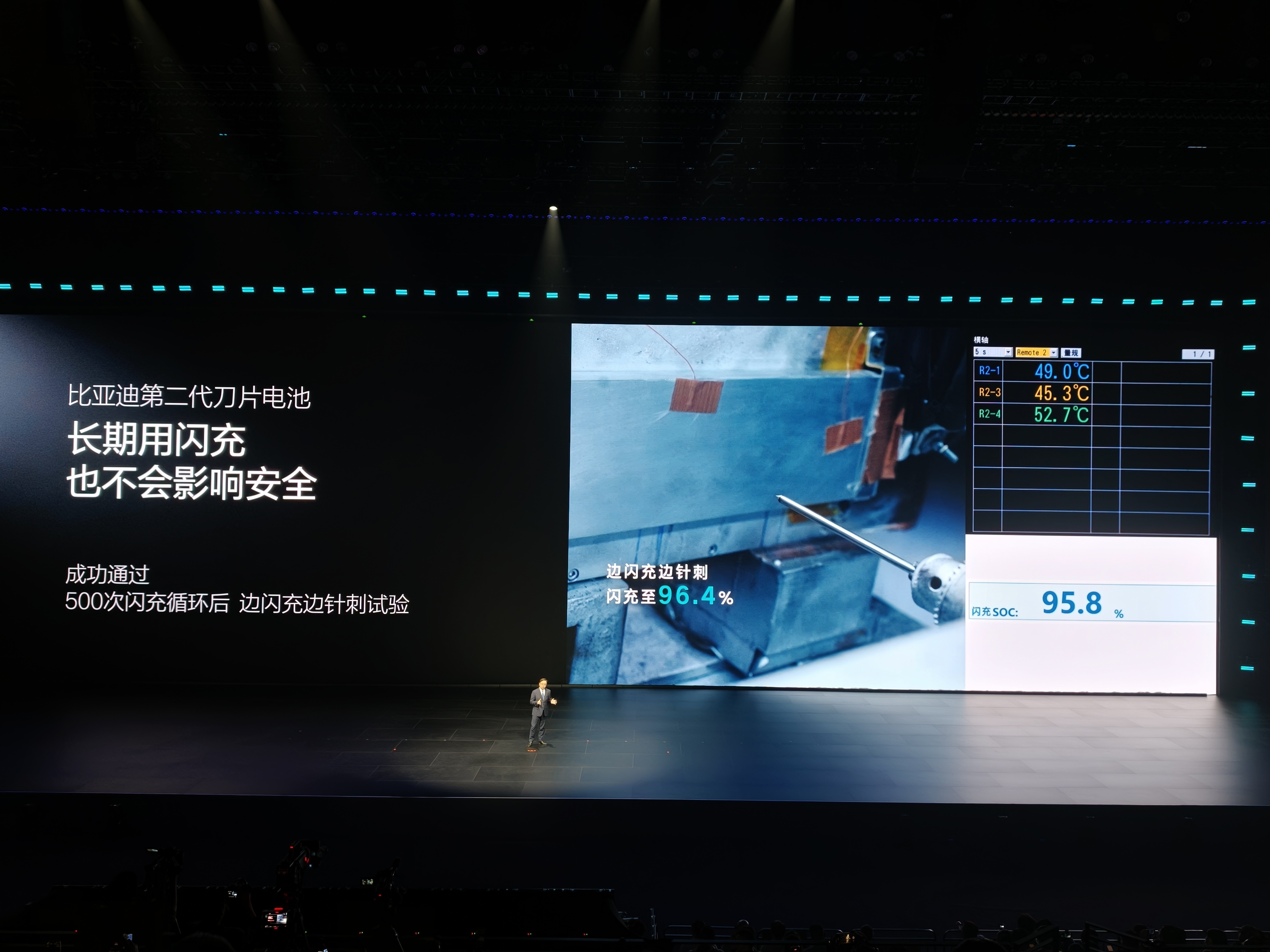 第二代刀片电池,这么快的快充,还能保证使用寿命,售后质保加码!并且可以在500次循环使用后,边闪充边针刺,安然无恙!