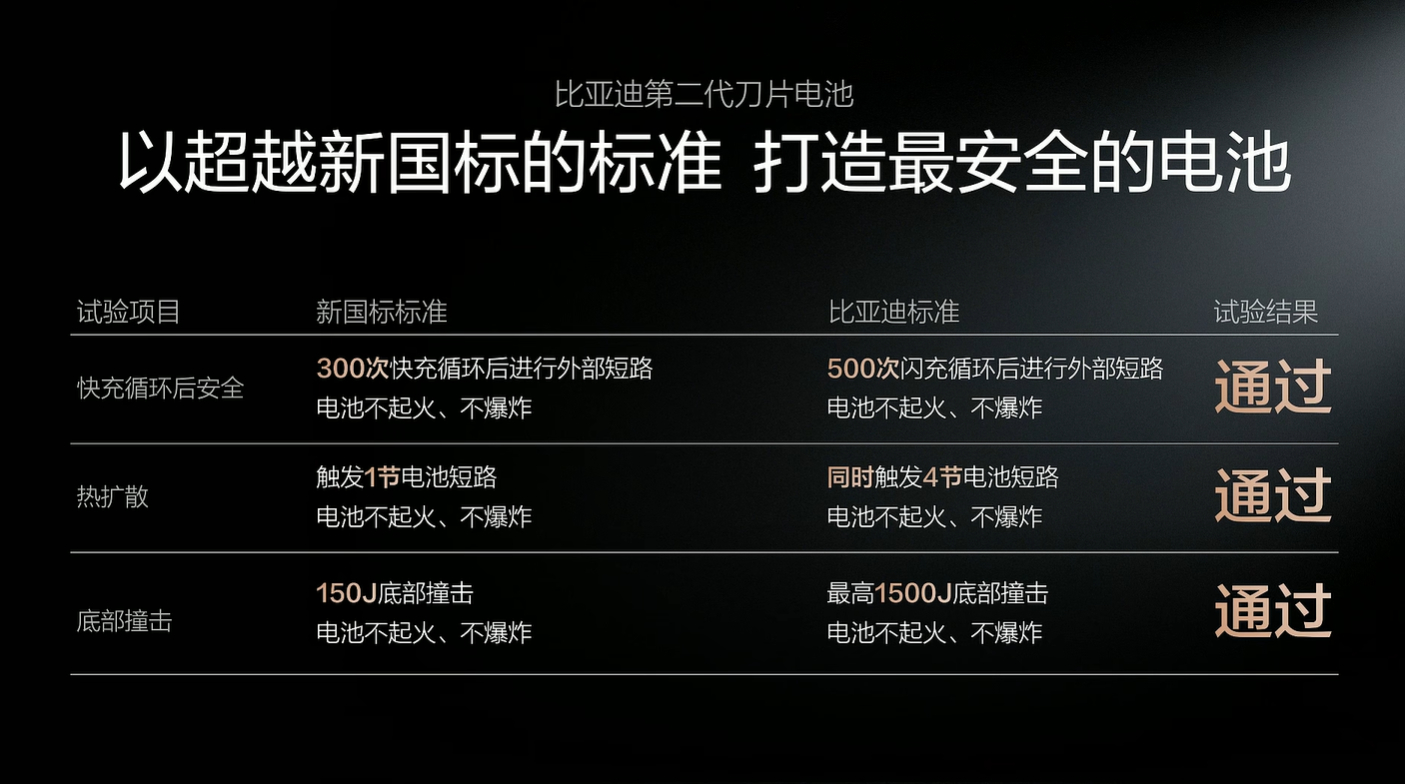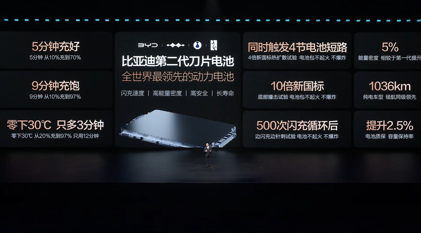 比亚迪第二代刀片电池不仅能量密度提升,充电速度更快,就连零下30度也照样可以12分钟充饱,就连安全标准均超新国标要求。