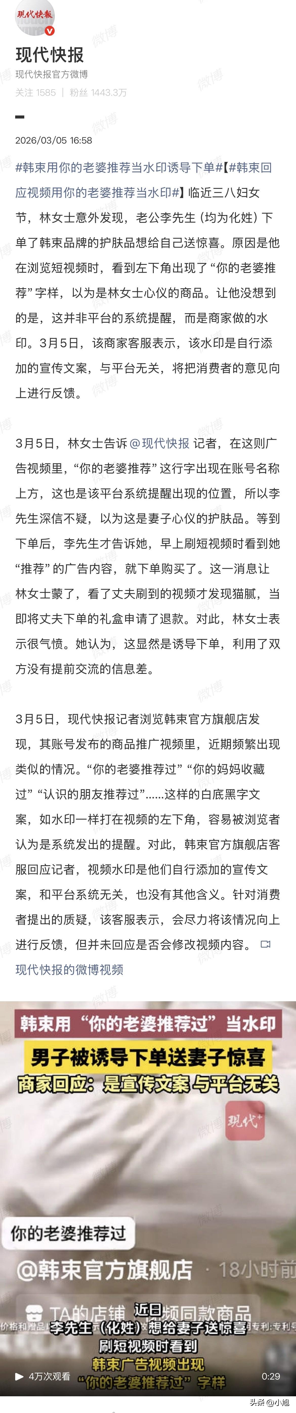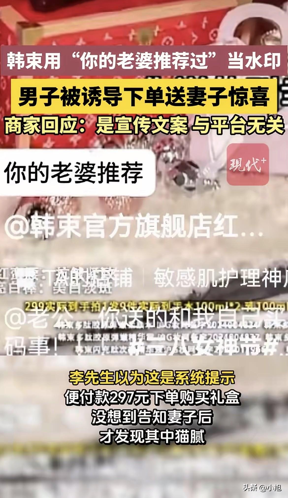郑州的李先生,三八节前想给媳妇个惊喜,刷视频时左下角明晃晃跳出“你的老婆推荐”几个字。那位置、那字体,跟平台平时弹的“朋友赞过”“好友收藏”一模一样。李先生压根没多想,手指一点就付了钱。 买完还美滋滋跟林女士邀功:我看见你推荐的东西了,直接下单了。 林女士听完愣了——我推荐啥了? 拿过手机一看才明白,哪是她推荐的,那是商家自己打上去的水印。 这事有意思的地方在哪?韩束这牌子不是头一回玩这种“看着像系统消息”的把戏了。记者去他们官方旗舰店一翻,好家伙,水印版本还挺多:“你的老婆推荐过”“你的妈妈收藏过”“认识的朋友推荐过”,跟集邮似的。 位置选得也讲究,就在账号名称上方,正是平台消息常年出现的地儿。不放大仔细看,根本分不清是系统提醒还是广告文案。 客服倒是实诚,承认这就是他们自己加的宣传文案,跟平台没关系,也没别的意思。至于改不改,说会向上反馈。 这话听着耳熟不?向上反馈——基本上就等于这事先搁着。 林女士算运气好,发现得早退了款。但多少人买了单到现在还蒙在鼓里?多少人以为是老婆给的暗示,偷偷摸摸买了单还等着对方夸自己懂事儿? 韩束这品牌挺有意思。查查它的发家史就知道,这牌子是踩风口的高手。2023年靠着一口气投了22部短剧,硬生生在抖音杀出一条血路,连续14个月霸榜美妆榜单,一年卖了将近31个亿。 短剧里怎么植入?甜宠剧情里男女主感情升温时,女主顺手拿起韩束红蛮腰礼盒,弹幕飘过“同款get”。这种软植入把产品跟“甜蜜”“恋爱”“被宠”的情绪绑在一起,卖得那叫一个火。 但问题是,风口总有过去的一天。短剧看多了观众也腻,播放量开始下滑。韩束在天猫等其他平台又一直没做起来,抖音一家就占了它销售额的八成以上。渠道偏科这么严重,哪天抖音算法一变,流量成本一涨,日子就难过了。 更麻烦的是,这牌子跟“虚假宣传”这几个字缘分不浅。2016年就被工商罚过,因为广告里说产品能“越晒越白”,专家一看这不反科学吗?罚款110万。 今年又有打假博主爆出来,韩束一款柔肤水宣传说有“进阶抗初老”“重塑熟龄肌”功效,结果去国家药监局官网一查,备案功效里压根没这些说法,只有“保湿”“抗皱”“紧致”。 还有检测机构检出,韩束部分产品里含有没在成分表上标注的防腐剂。 中国消费者报今年6月也调查过,韩束一款次抛精华液宣传页面上写着“100%认同缓解干痒”“100%认同肌肤弹嫩”,但备案信息里根本没有这些数据支持,底部一行灰白小字写着“数据来源于第三方测试报告,实际效果因人而异”。 这套路熟不熟悉?大字往大了吹,小字往小了藏。 现在又玩起“你的老婆推荐”这种水印。说穿了,就是利用两口子之间的信息差——谁也不会天天对账你今天刷到什么我点过什么。你看见“你老婆推荐”几个字,下意识以为是系统根据她的浏览记录推给你的,哪会想到这是人家自己打上去的? 商家这点心思摸得透透的。三八节想送个惊喜,结果让人当傻子耍了一圈。 客服说“会向上反馈”。反馈啥呢?反馈这种套路被发现了?还是反馈下次换个别的说法? 林女士这事算是个缩影。多少人买东西,买的是“媳妇可能喜欢”的那份心意,结果买的是商家精心设计的一个心理陷阱。 这事你怎么看?刷视频要是看见“你老婆推荐”“你妈收藏过”,你会不会也直接下单? 来源:现代快报