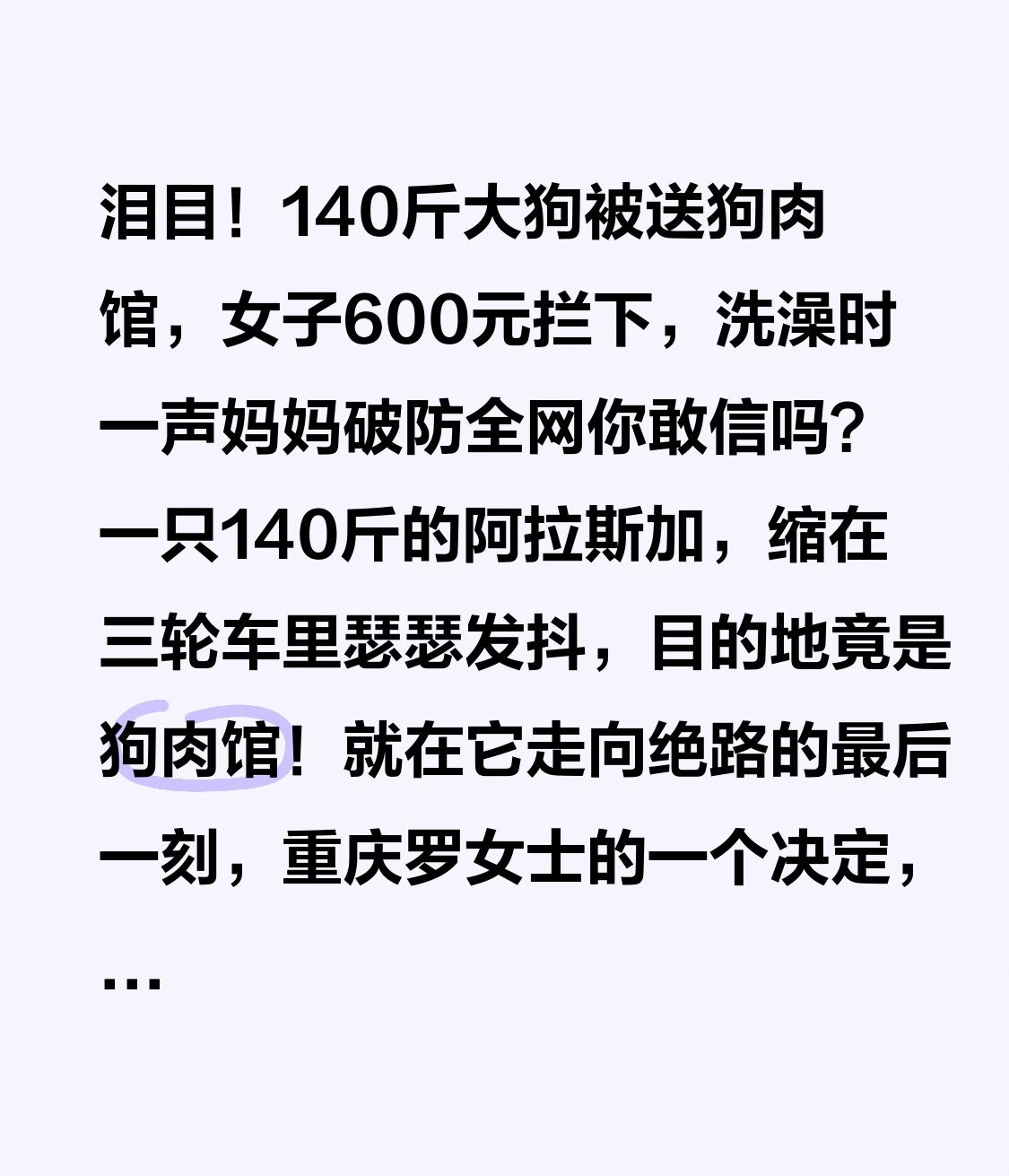 泪目!140斤大狗被送狗肉馆,女子600元拦下,洗澡时一声妈妈破防全网 你敢信吗?一只140斤的阿拉斯加,缩在三轮车里瑟瑟发抖,目的地竟是狗肉馆!就在它走向绝路的最后一刻,重庆罗女士的一个决定,让无数人瞬间破防! 重庆街头,一辆三轮车缓缓驶过,车斗里的大狗眼神绝望,浑身是灰,连叫都不敢大声。车主大爷说,这狗是家人留下的,自己年纪大不会养,干脆卖给狗肉馆换点钱。一句轻飘飘的“不会养”,就把一条陪伴过家庭的生命,判了死刑。 路过的人不少,有人匆匆走过,有人劝罗女士别多管闲事。可她看着狗狗无助的眼神,听着它压抑的呜咽,心像被狠狠揪住。没有犹豫、没有还价,她当场掏出600元:“这狗,我买了!” 600元,不够一顿火锅、一件衣服,却给这条命换来了重生。谁也没想到,更大的泪点还在后面。 罗女士把狗带回家洗澡,这只庞然大物温顺得像个孩子,一边蹭她的手,一边发出轻轻的呜咽,一声声像在喊“妈妈”。它什么都懂,知道谁在救它,知道自己终于不用害怕了。 很多人不知道,罗女士从2025年7月就开始做救助,至今已经救下150多只猫、十几只狗,家里小院早就挤得满满当当。救下这只大狗,她既心疼又为难——实在没地方养,只能盼着给它找个靠谱领养人,一辈子被温柔对待。 有人说600元不值,可在爱狗人心里,生命从来不能用价钱衡量。它曾经也是家里的宝贝,被抛弃、被送上餐桌,不是它的错。 一句承诺,一生陪伴。养了就别弃,不爱也别伤害。每一个生命都值得被善待,每一份善良都不该被辜负。 如果你也被罗女士的善举打动,点赞+转发,让更多人看见:人间有爱,毛孩子不孤单!也希望这只大狗,早日遇到真正疼它的家人。