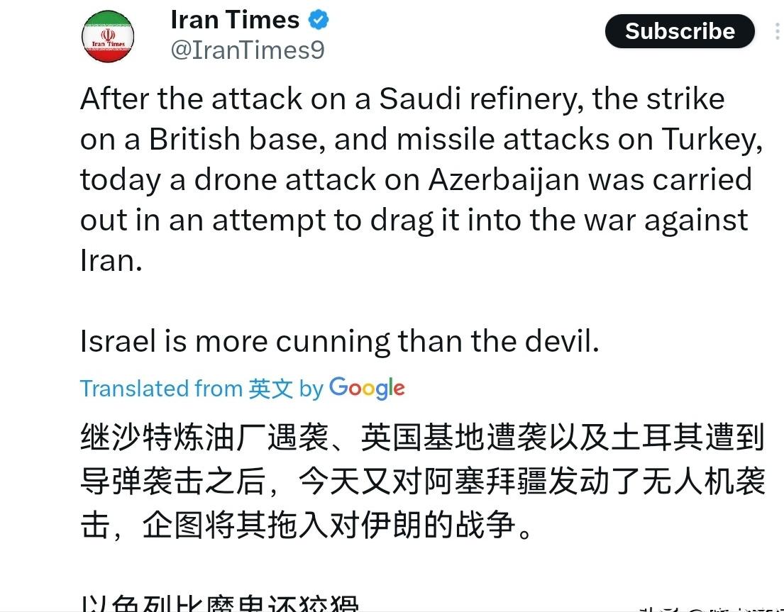 没想到以色列玩的这么阴! 3月5日,伊朗时报表示,继沙特炼油厂遇袭、英国基地遇袭、土耳其遭导弹袭击之后,今天又对阿塞拜疆实施了无人机袭击,以色列企图将这些国家拖入对伊朗的战争。以色列比魔鬼更狡猾。很显然,伊朗媒体的报道,传递的是什么信息呢?一句话,那就是以色列正在趁乱对伊朗进行栽赃陷害。 可能很多朋友看到这会疑惑,以色列为啥要费这么大劲,绕着圈子栽赃伊朗?其实核心就一个,它打不过伊朗,只能玩阴的,想拉着一群“帮手”一起对付伊朗。咱们先把最近这几件事串起来,大家就明白了,这根本不是巧合,而是以色列精心布下的局。 3月2日的沙特炼油厂遇袭事件,当时全球油价都跟着涨,一开始不少西方媒体直接把矛头指向伊朗,说这是伊朗对美以打击的报复。 但没过24小时,剧情就反转了——伊朗坚决否认,还直接点出幕后黑手是以色列,而沙特和卡塔尔随后逮捕了多名摩萨德特工,这些人手里还带着爆炸装置,就是打算制造混乱后栽赃伊朗的。这一下,以色列的狐狸尾巴就露出来了。 紧接着,3月4日凌晨,塞浦路斯的英国空军基地遭了殃,伊朗的无人机精准命中了基地的跑道、雷达和油库,造成了不小的损失。一开始大家都以为这是伊朗主动挑事,可后来才知道,这个基地是以色列空袭伊朗的重要跳板,以色列原本计划从这里起飞战机,继续打击伊朗。 说白了,伊朗这是被动反击,而以色列却借着这件事,到处渲染“伊朗威胁论”,试图让英国彻底站到自己这边。 这边英国基地的硝烟还没散,土耳其又被卷了进来。3月3日,北约击落了一枚从伊朗发射、飞往土耳其领空的弹道导弹,虽然没有造成人员伤亡,但土耳其还是提出了抗议。这事看似是伊朗的失误,可细想一下就不对劲——伊朗一直明确表示,打击目标只针对美以的军事设施,绝不会主动招惹第三方国家。 更关键的是,以色列早就知道土耳其有北约的早期预警雷达,故意制造这种“导弹越境”的假象,就是想让土耳其对伊朗产生敌意,甚至推动北约介入冲突。 而3月5日,阿塞拜疆遭遇的无人机袭击,更是把这个局推向了高潮。当天阿塞拜疆外交部表示,自家的纳希切万机场遭到无人机袭击,造成2人受伤,一开始还指责是伊朗干的。可没过多久,伊朗就发布公告,坚决否认,还直接点破,这又是以色列的栽赃陷害。果不其然,结合之前的种种迹象,明眼人都能看出来,以色列就是想让阿塞拜疆也加入到反对伊朗的阵营里。 可能有人会问,以色列这么做,到底图什么?其实道理很简单,它现在陷入了两难境地。一方面,伊朗的反击越来越猛,3月5日当天,伊朗的高超音速导弹和无人机甚至突破了美国的“萨德”系统,直接袭击了以色列的国防部大楼和本·古里安国际机场,以色列根本没法单独顶住伊朗的压力。另一方面,中东地区的很多国家,比如沙特、卡塔尔,都不想介入美以和伊朗的冲突,一直保持中立,这让以色列感到非常孤立。 所以以色列才想出了这种栽赃陷害的阴招,它的算盘打得很精:只要让沙特、土耳其、阿塞拜疆这些国家相信,自己的国家是被伊朗袭击的,这些国家为了自保,就只能选择和以色列、美国站在一起,形成一个针对伊朗的联盟。 到时候,以色列就能借别人的手,削弱伊朗的实力,自己坐收渔翁之利。这种手段,其实以色列早有前科,早在1954年,以色列就曾在埃及制造恐怖爆炸事件,嫁祸当地宗教团体,试图破坏英美和埃及的关系,只不过那次最后败露了,还导致以色列一届政府垮台。 不过话说回来,以色列的如意算盘,恐怕很难得逞。现在越来越多的国家已经看清了它的真面目,沙特和卡塔尔逮捕摩萨德特工,就是最好的证明;伊朗也提前发声,揭露以色列的图谋,避免被栽赃;就连土耳其,也只是提出抗议,并没有真的要和伊朗为敌。大家都明白,一旦被以色列拖入战争,最终受伤的只会是自己的国家和人民。 说到底,以色列这种靠阴谋诡计挑起冲突、嫁祸他人的做法,根本解决不了问题,反而会让中东的局势越来越乱。现在的中东,需要的是和平与对话,而不是阴谋与战争。以色列如果继续执迷不悟,一味地玩阴的、挑事,最终只会搬起石头砸自己的脚,被越来越多的国家孤立。毕竟,再狡猾的狐狸,也总有露出尾巴的一天,正义或许会迟到,但绝不会缺席。